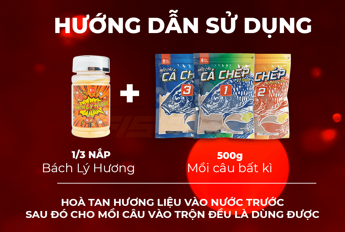 Sử dụng 1/3 nắp Bách Lý Hương cho 500g mồi câu. Có thể kết hợp với bất kỳ loại mồi câu hoặc cám nền nào. Hóa tan hương liệu vào nước trước, sau đó cho mồi câu vào trộn đều là dùng được.
