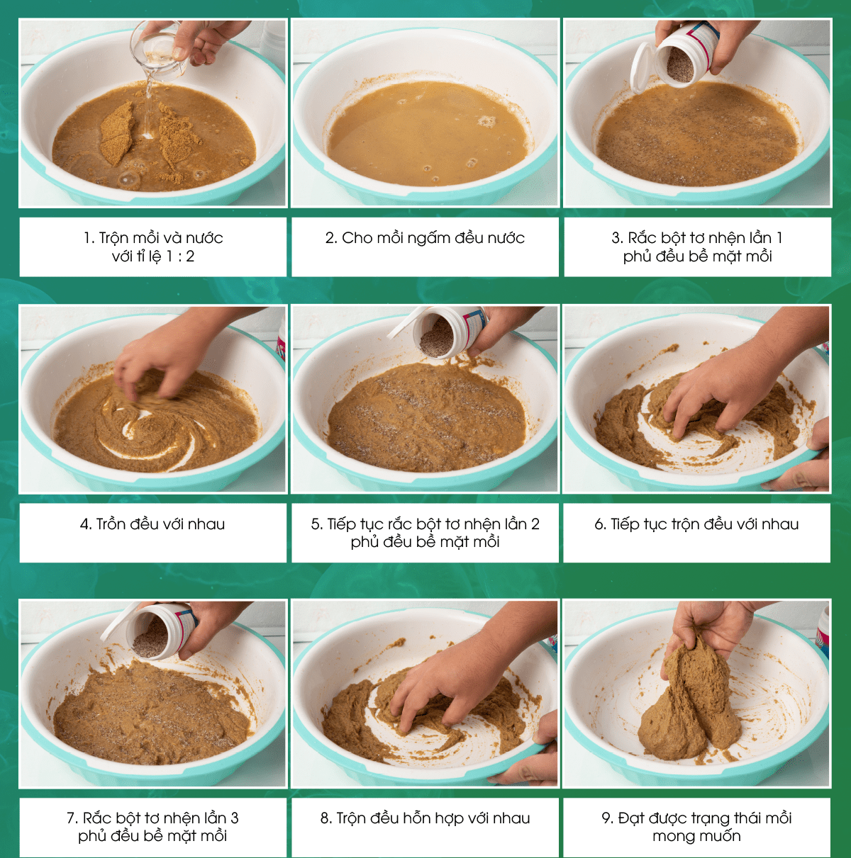 Hướng dẫn sử dụng: Mồi vuốt sử dụng 20g bột tơ nhện cho 100g mồi câu. Mồi vê sử dụng 3g bột tơ nhện cho 100g mồi câu.