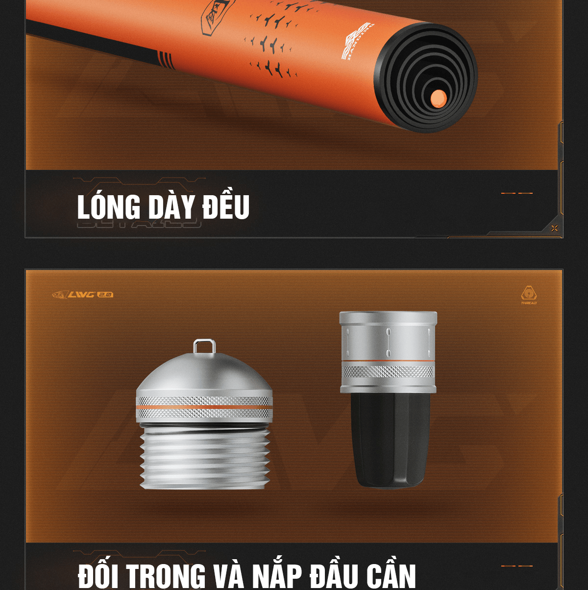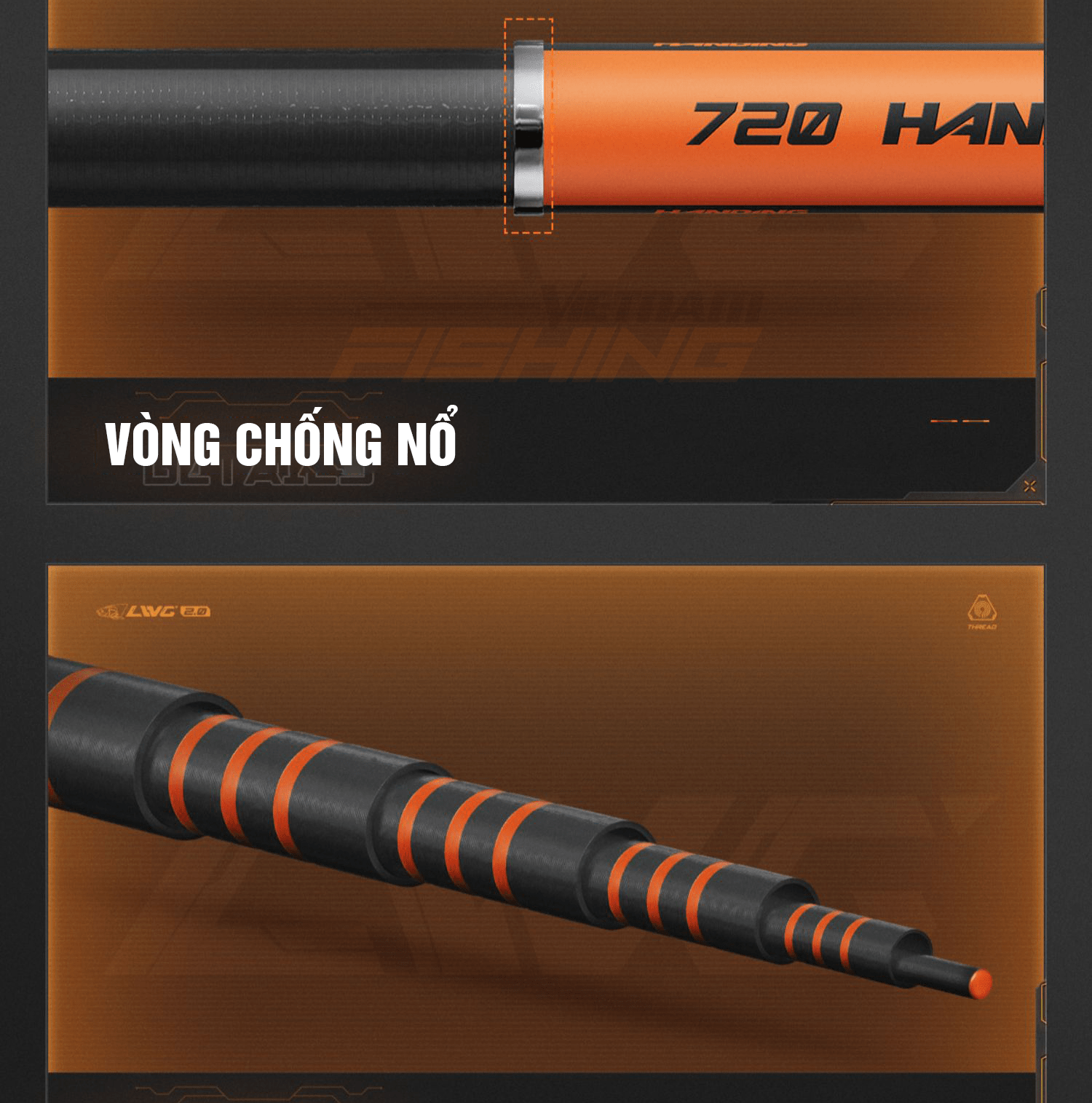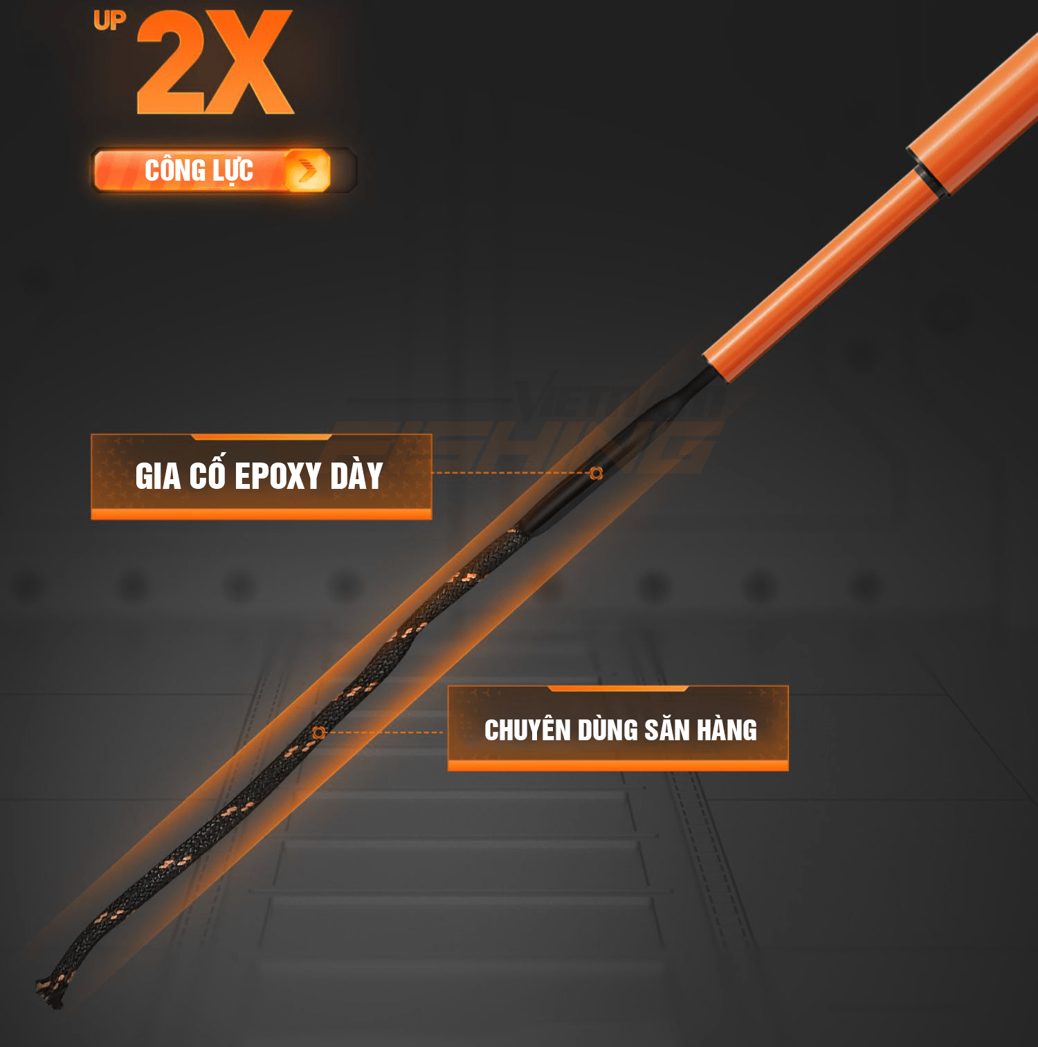 Ngọn cần được gia cố bằng 1 lớp keo Epoxi dẻo dai và chắc chắn, chuyên dùng săn hàng. Lóng cần được trang bị rãnh ABS chống bó cứng, kẹt lóng hiệu quả.