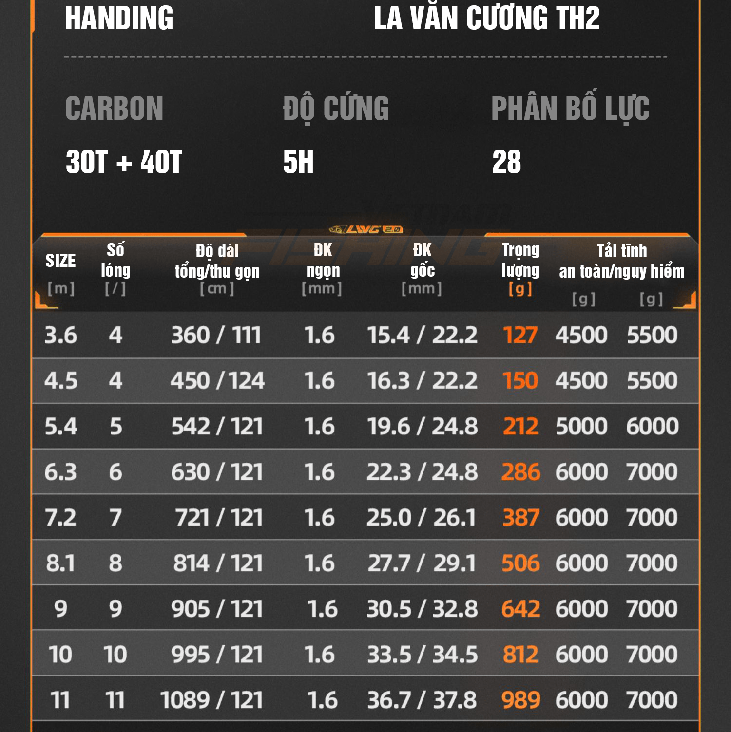 Cần câu Handing La Văn Cương thế hệ II là dòng cần câu săn hàng mới ra mắt trong năm 2023 của nhà Handing. Phiên bản nâng cấp với diện mạo hoàn toàn mới sắp xếp và kết hợp nhiều lớp vải Carbon 30T +40T mật độ cao giúp cần nâng cấp độ cứng, mạnh mẽ hơn thế hệ trước, sức tải tĩnh cao, độ nảy tốt.