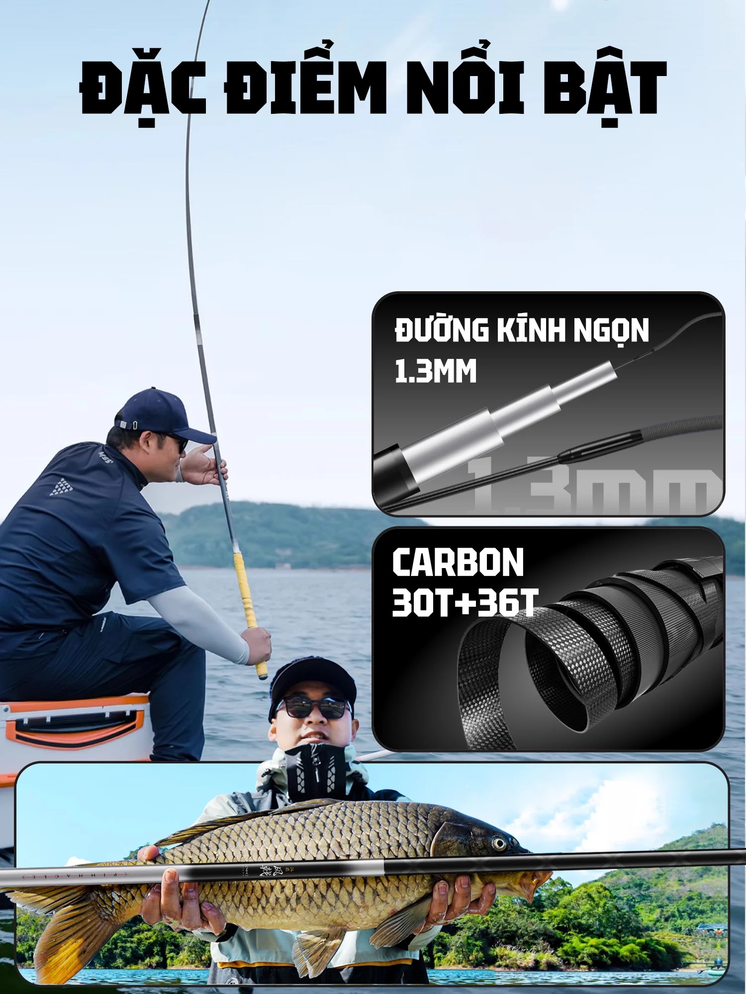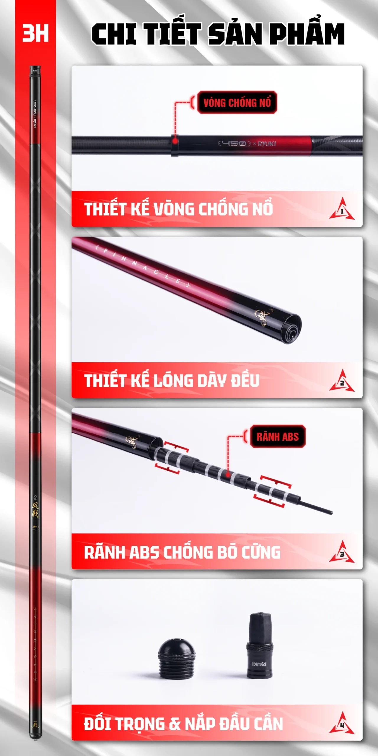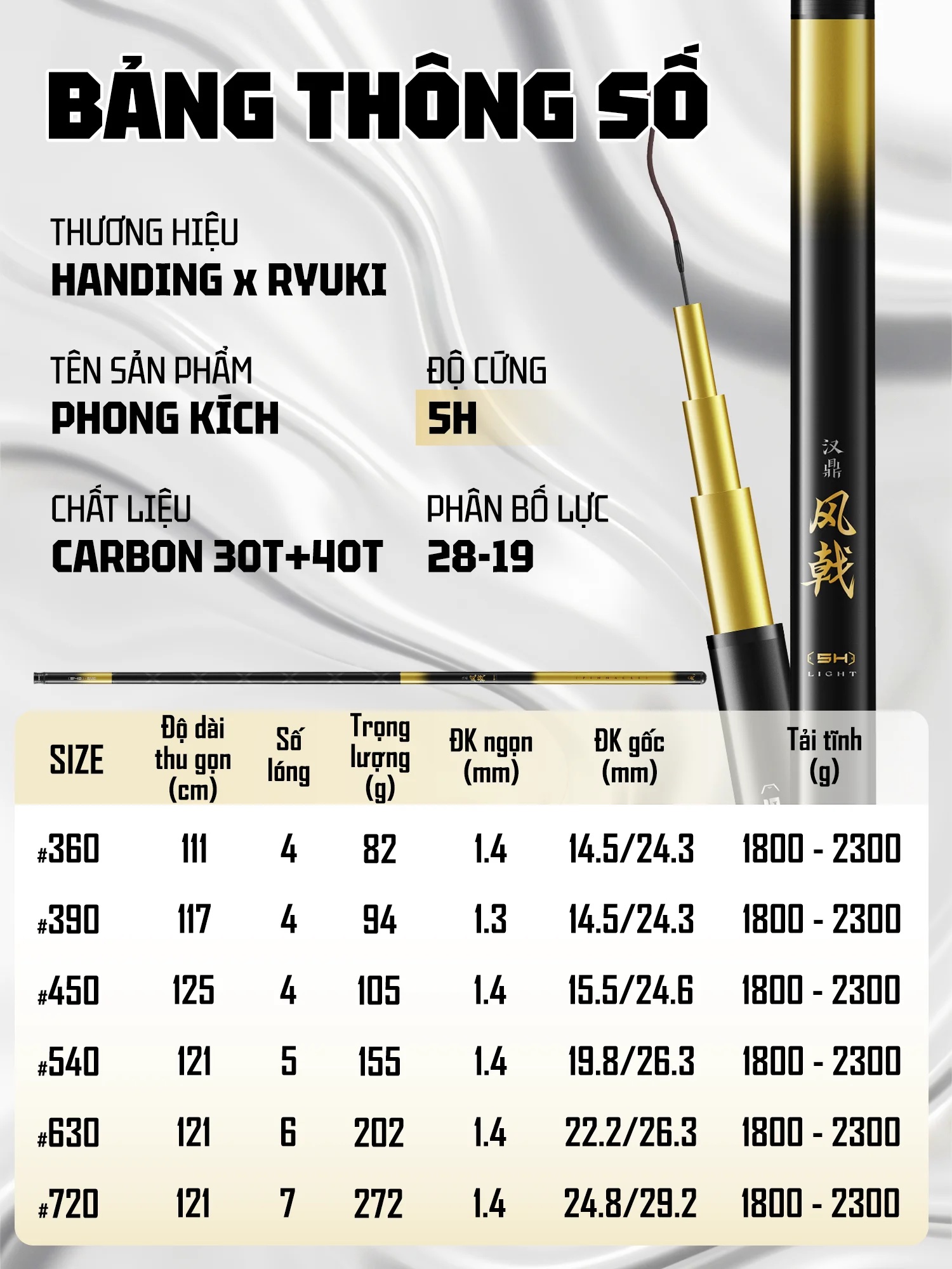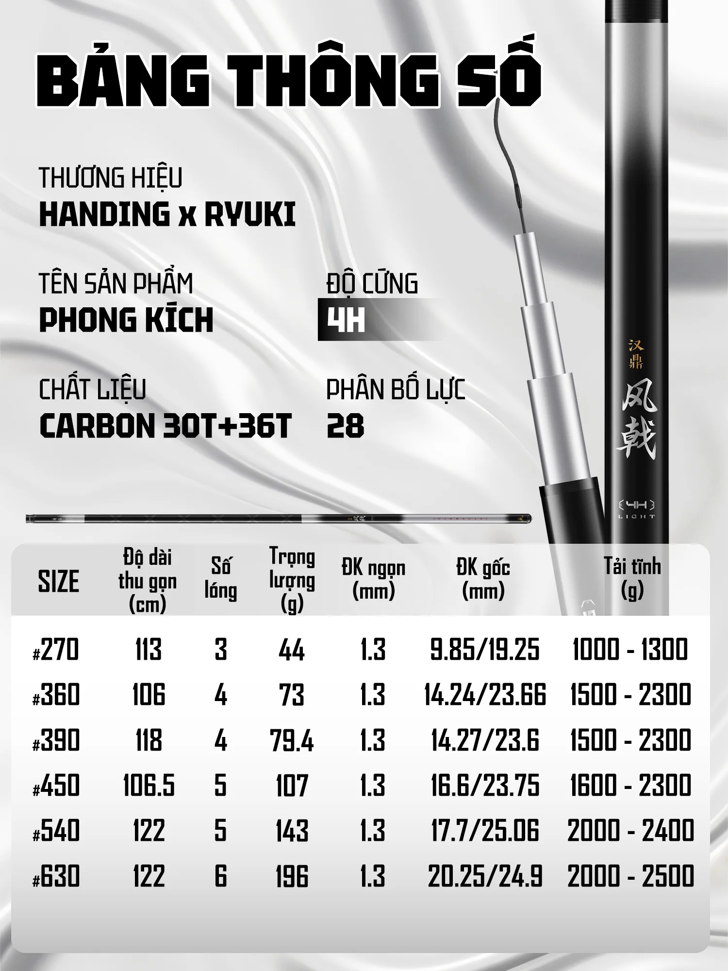 Mẫu sản phẩm thế hệ mới, với sự kết hợp của hãng HANDING và RYUKI, sử dụng chất liệu Carbon 30T mới nhất, với ưu điểm trọng lượng nhẹ, độ nảy cao. Mang lại cảm giác cầm nắm nhẹ nhàng, thoải mãi trong suốt buổi câu
