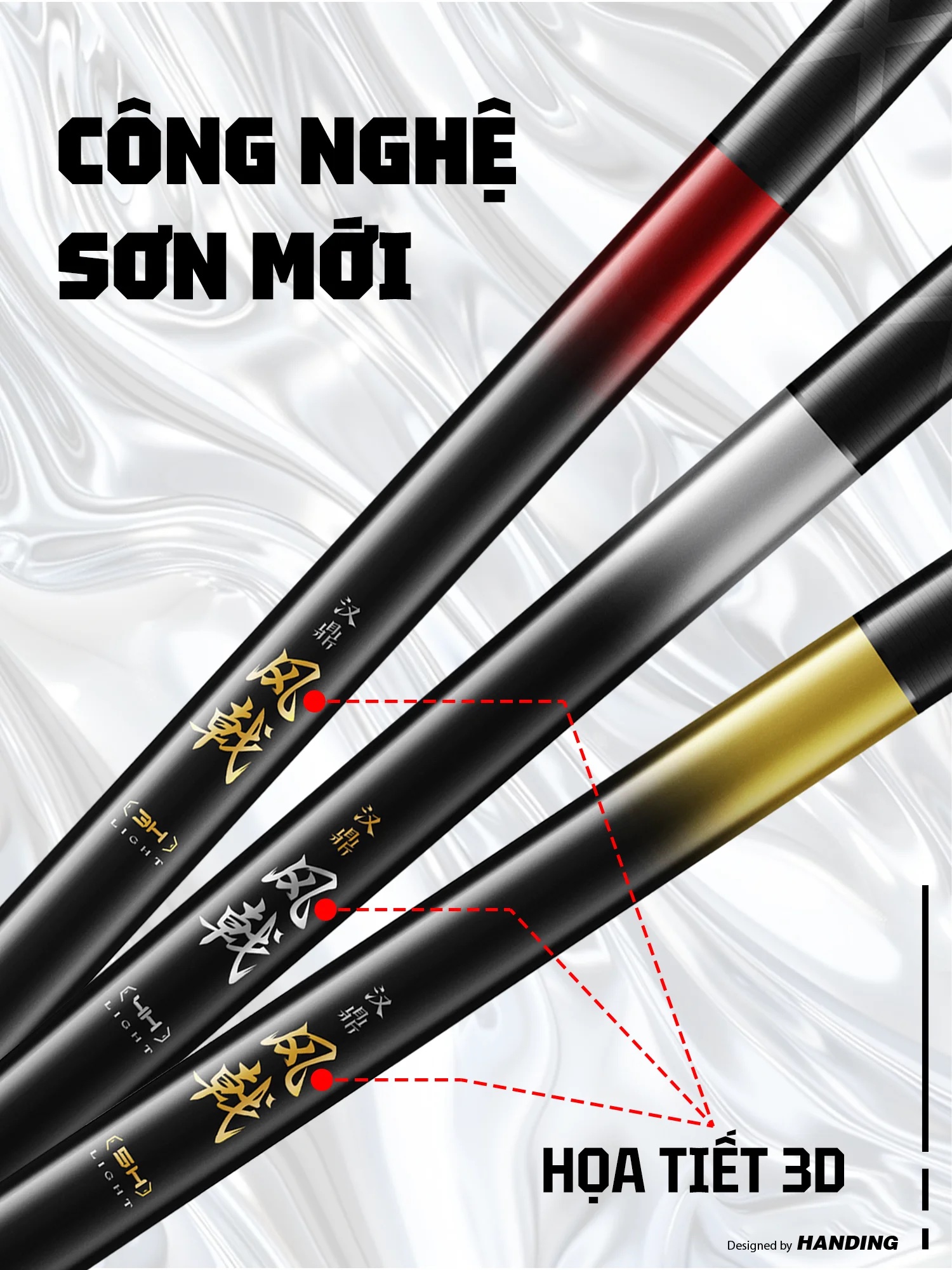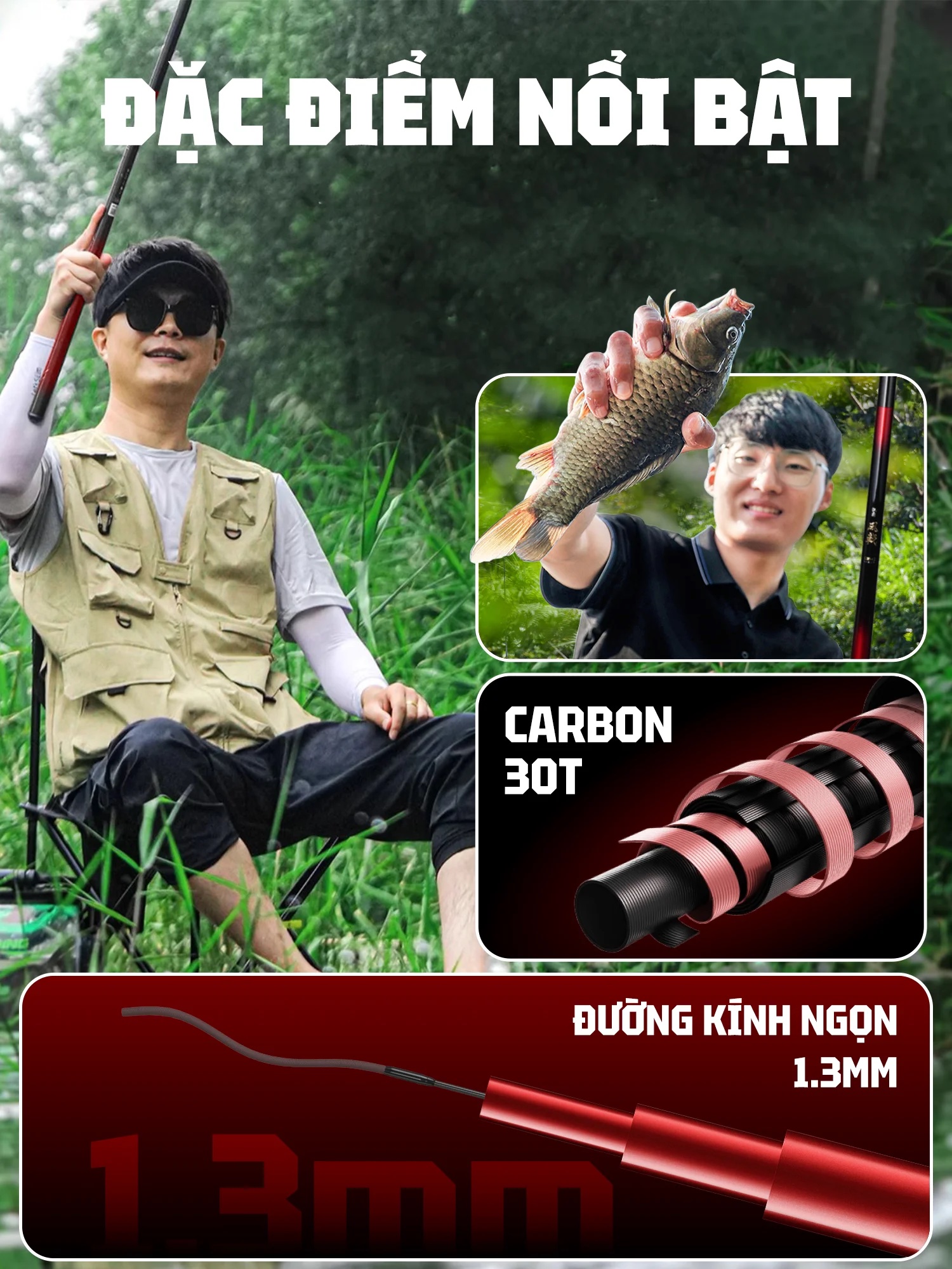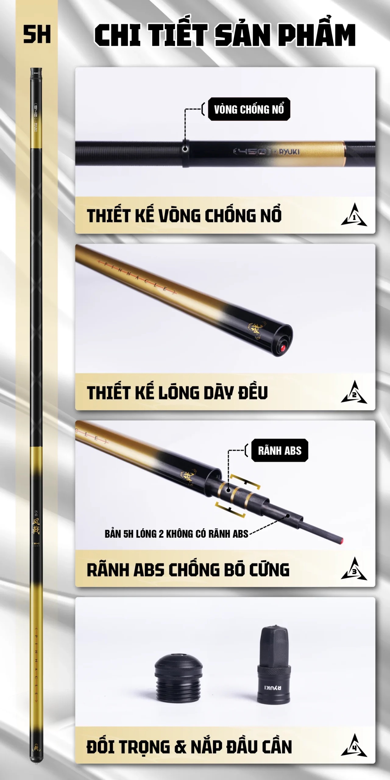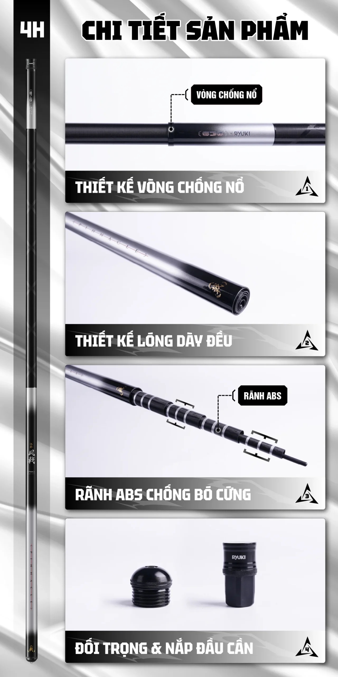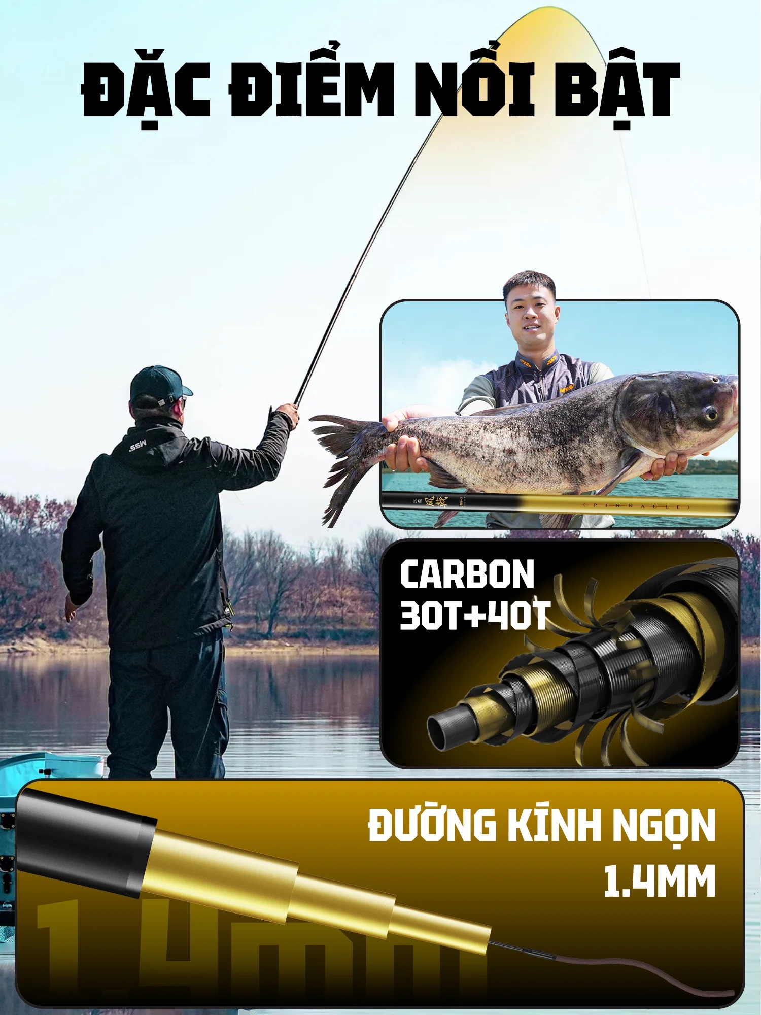 Mẫu sản phẩm thế hệ mới, với sự kết hợp của hãng HANDING và RYUKI, sử dụng chất liệu Carbon 30T mới nhất, với ưu điểm trọng lượng nhẹ, độ nảy cao. Mang lại cảm giác cầm nắm nhẹ nhàng, thoải mãi trong suốt buổi câu
