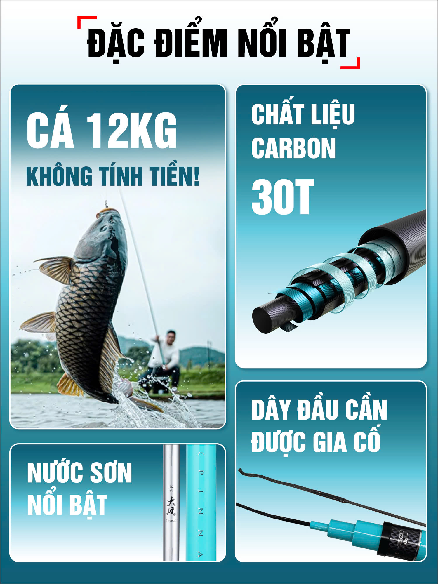 Cần có độ phân bổ lực 2:8, độ tải tĩnh an toàn từ 2600g đến 3100g tuỳ độ dài, phù hợp để câu tổng hợp các loại cá như Chép, Trắm, Rô Phi, cá Mè......