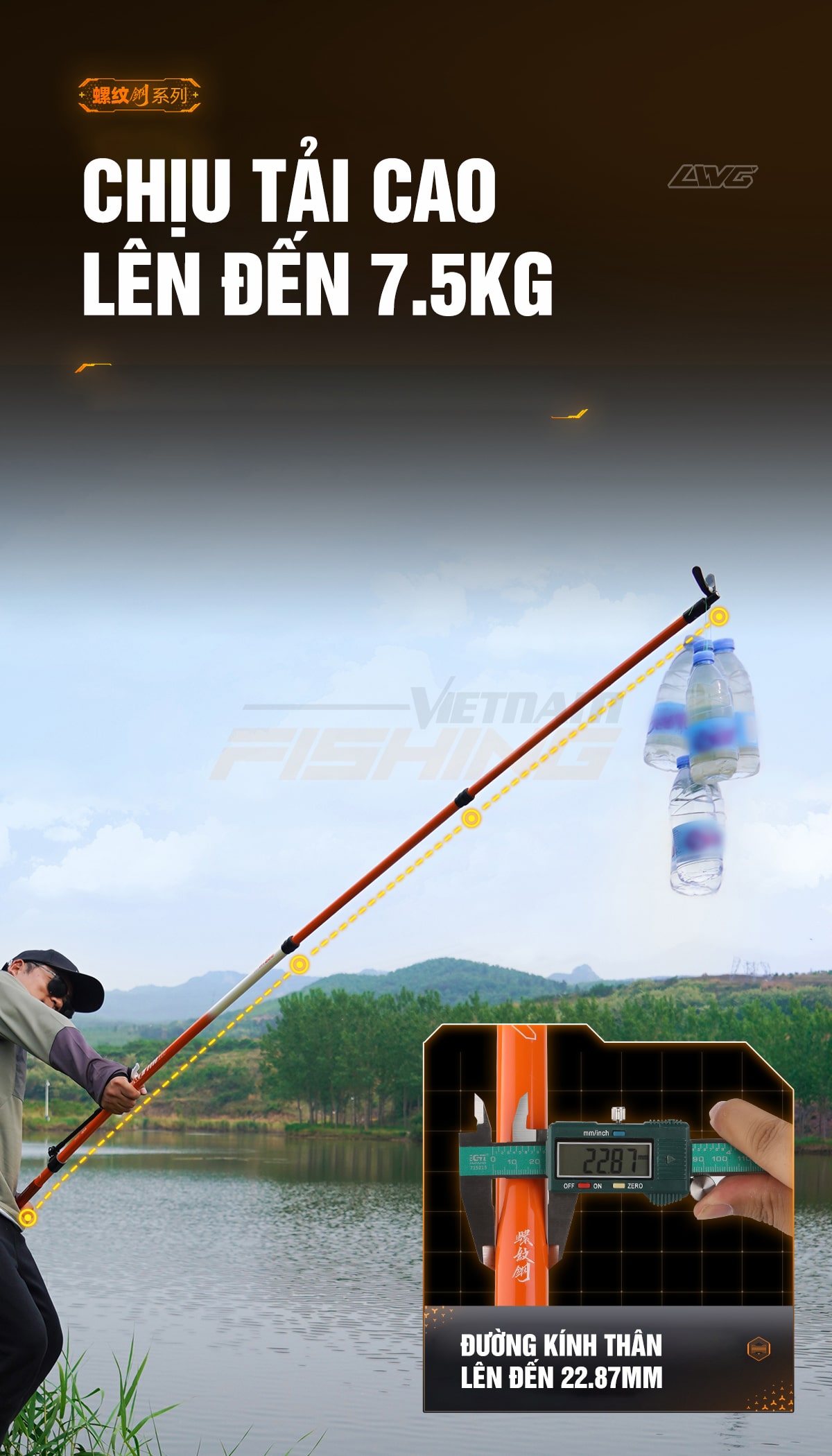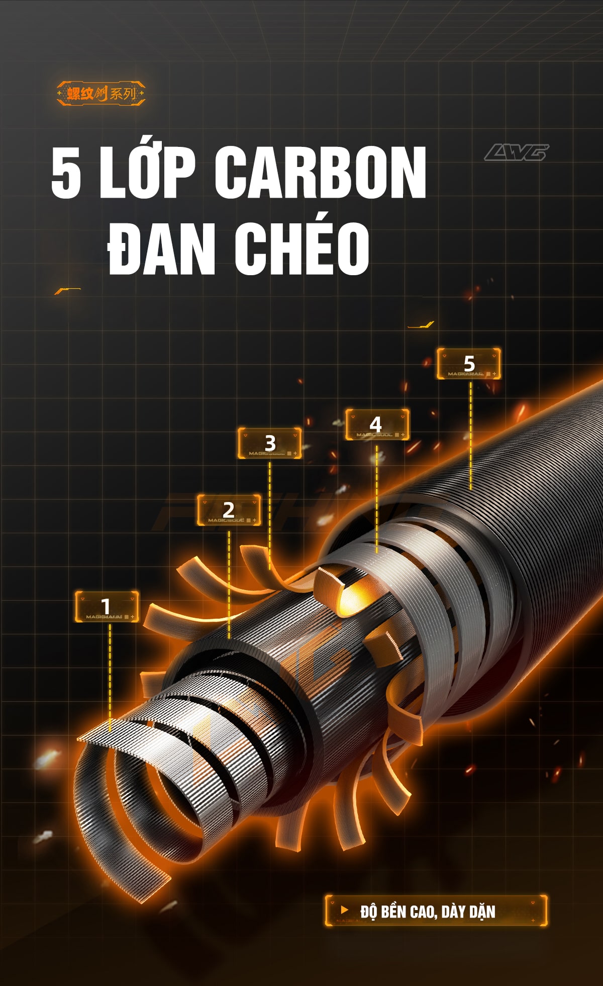 Thiết kế 5 lớp cacbon đan chéo dày dặn,giúp gác cần có độ nhẹ, độ bền cao và có độ chịu tải lên đến 7,5kg.