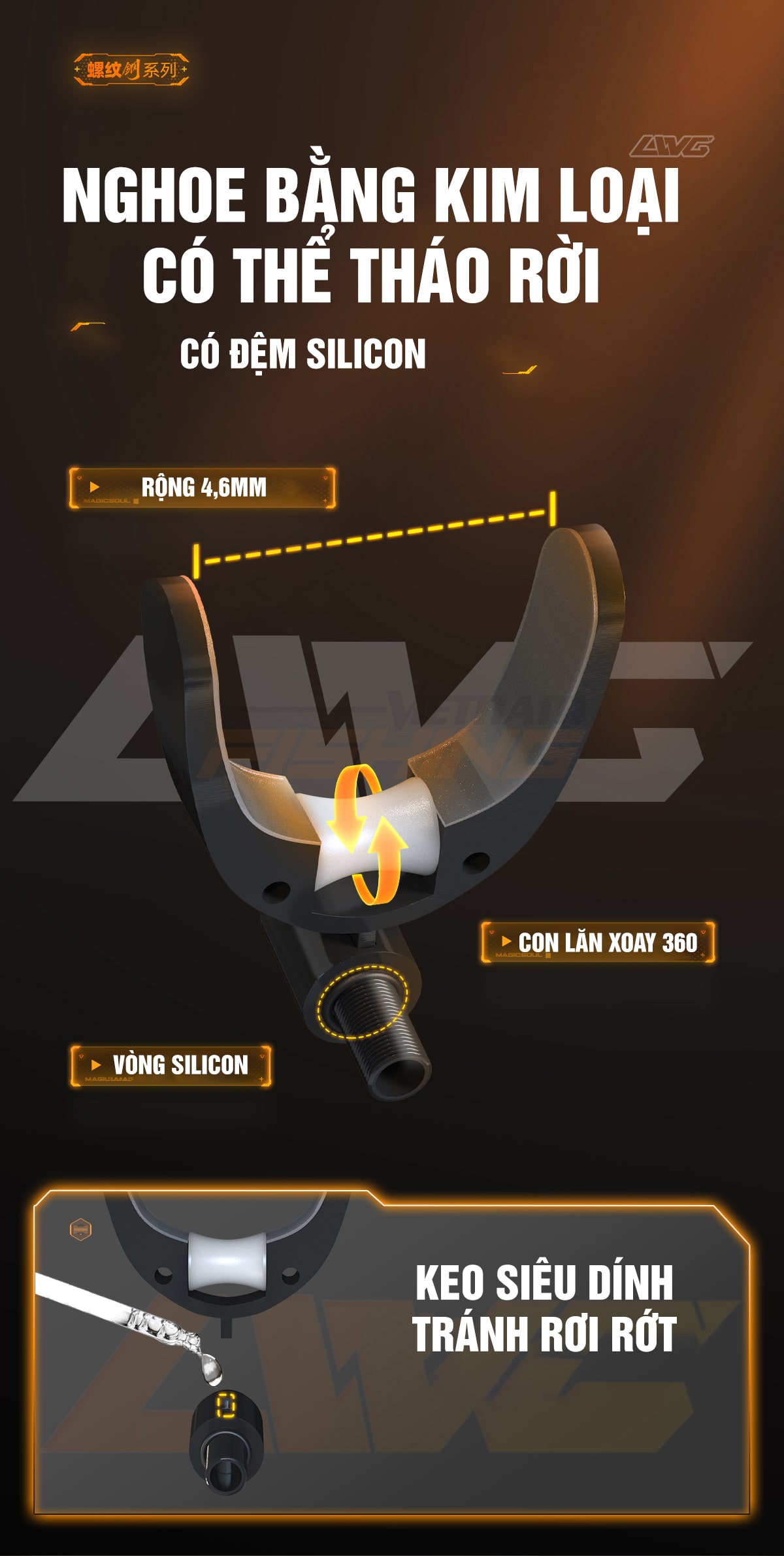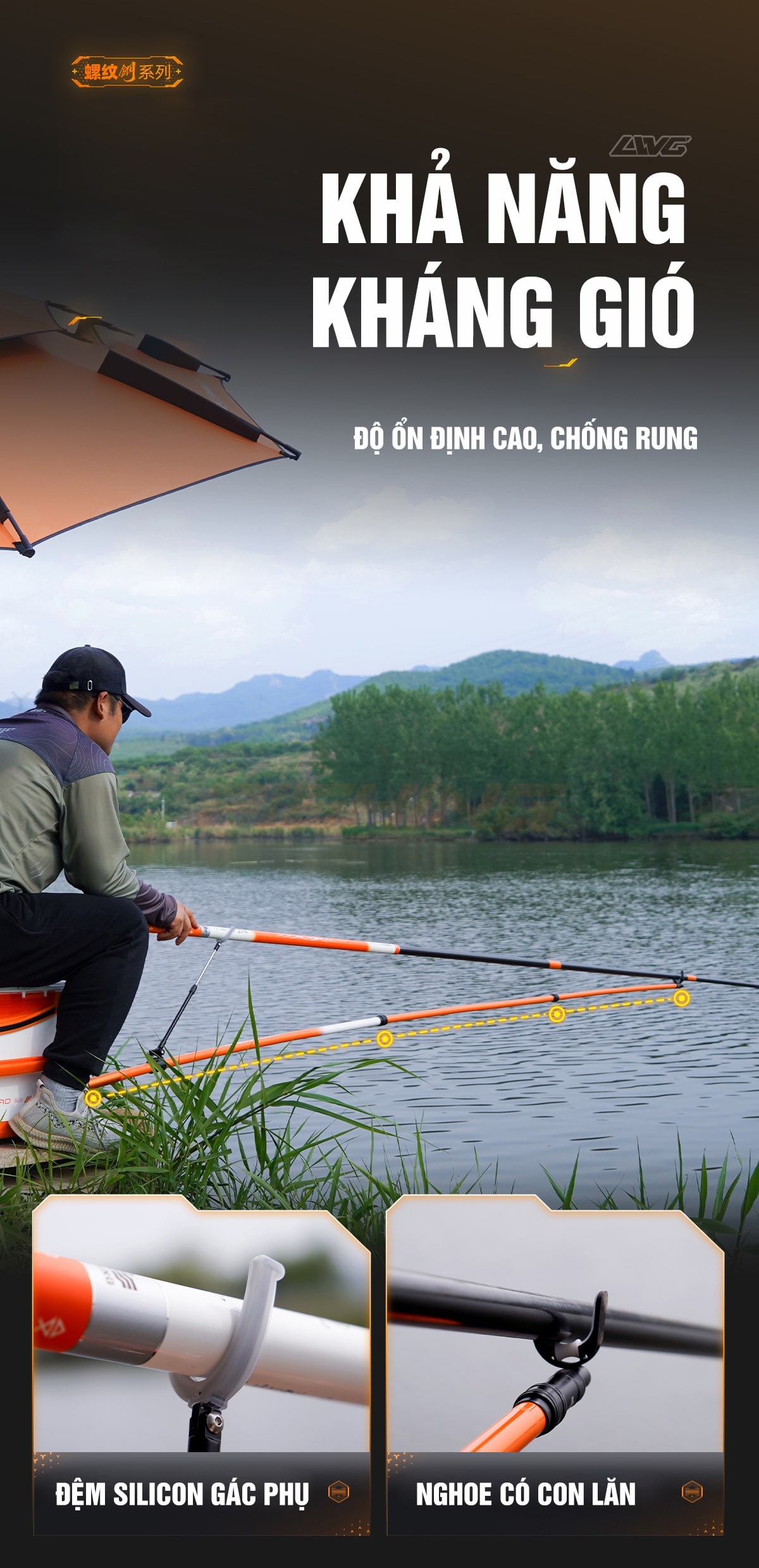 Nghoe bằng kim loại có thể tháo dời, con lăn xoay 90 độ được thiết kế với lớp silicon cao cấp chống làm tồn thương cần. Nghoe gác phụ xoay 180 độ, tùy chỉnh vị trí, có thể tháo rời vô cùng tiện lợi