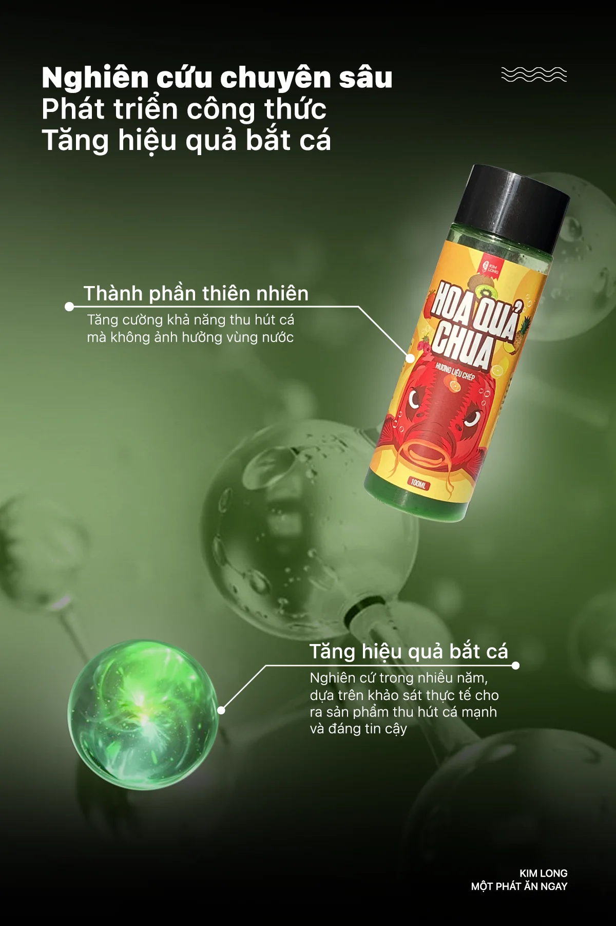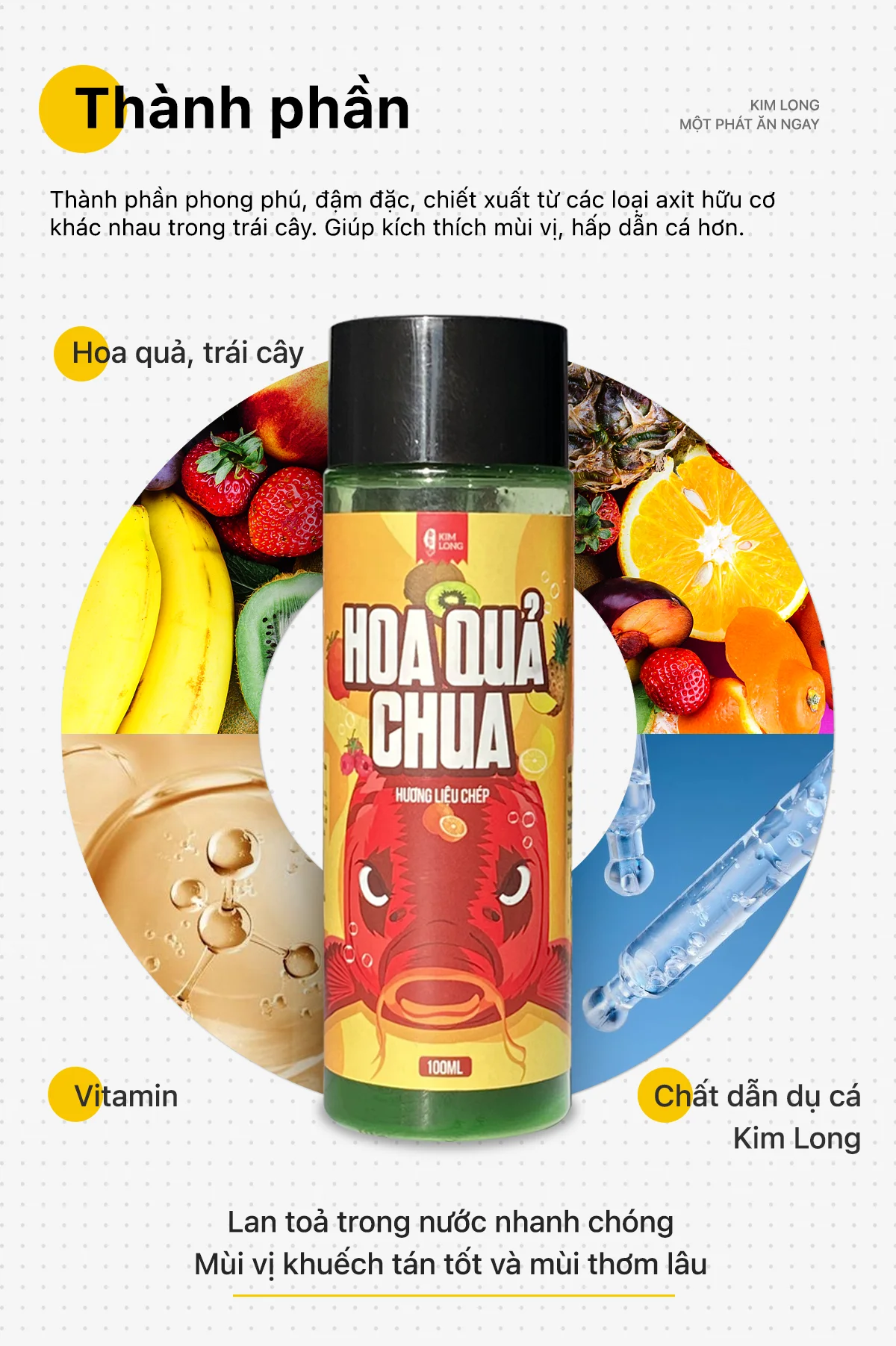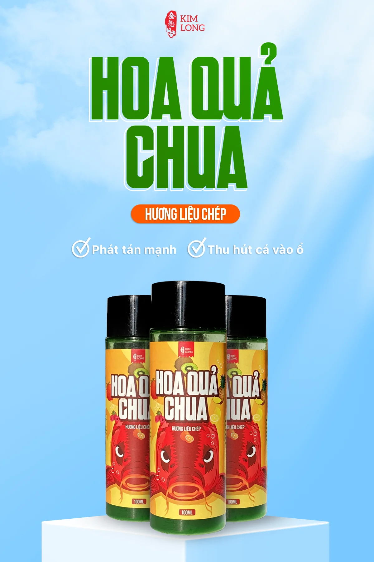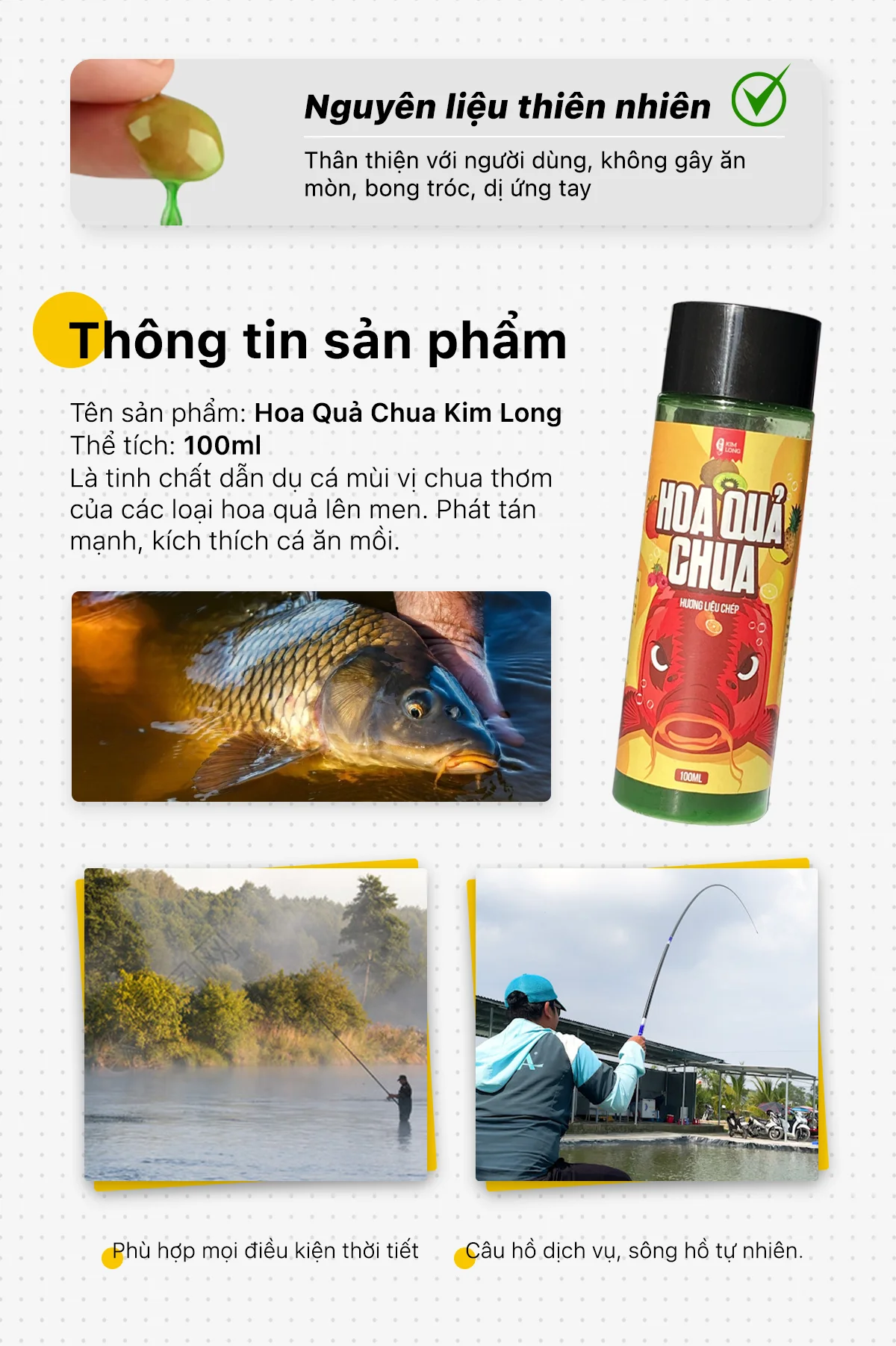 Hương liệu câu cá KIM LONG 100ml với hương vị hoa quả chua thanh mát, thơm lừng sẽ kích thích vị giác của mọi loài cá, đặc biệt là cá chép. Sản phẩm được chiết xuất từ các thành phần tự nhiên, an toàn cho người sử dụng và môi trường.