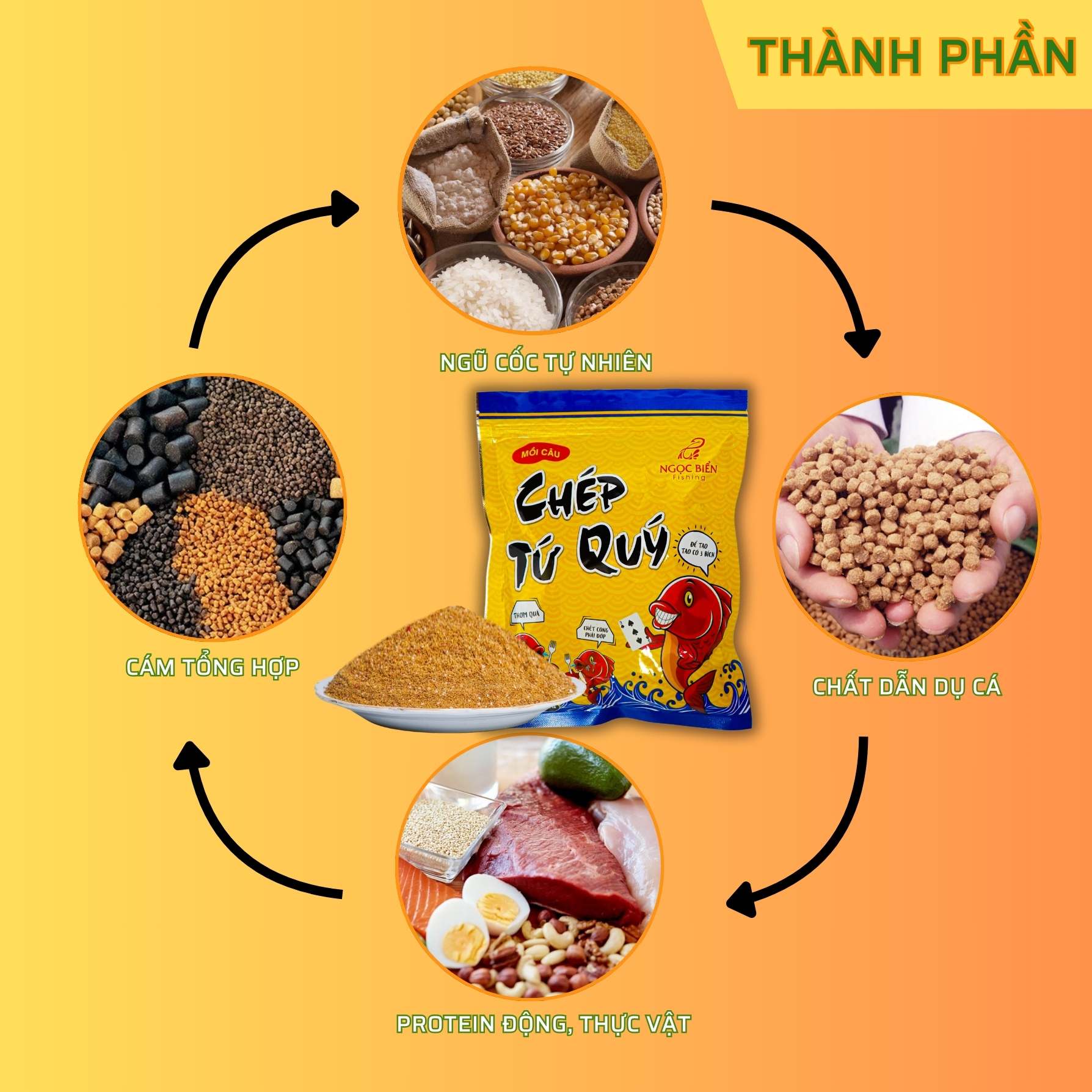 Thành phần: Cám tổng hợp, ngũ cốc tự nhiên, Protein động thực vật, chất dẫn dụ cá.