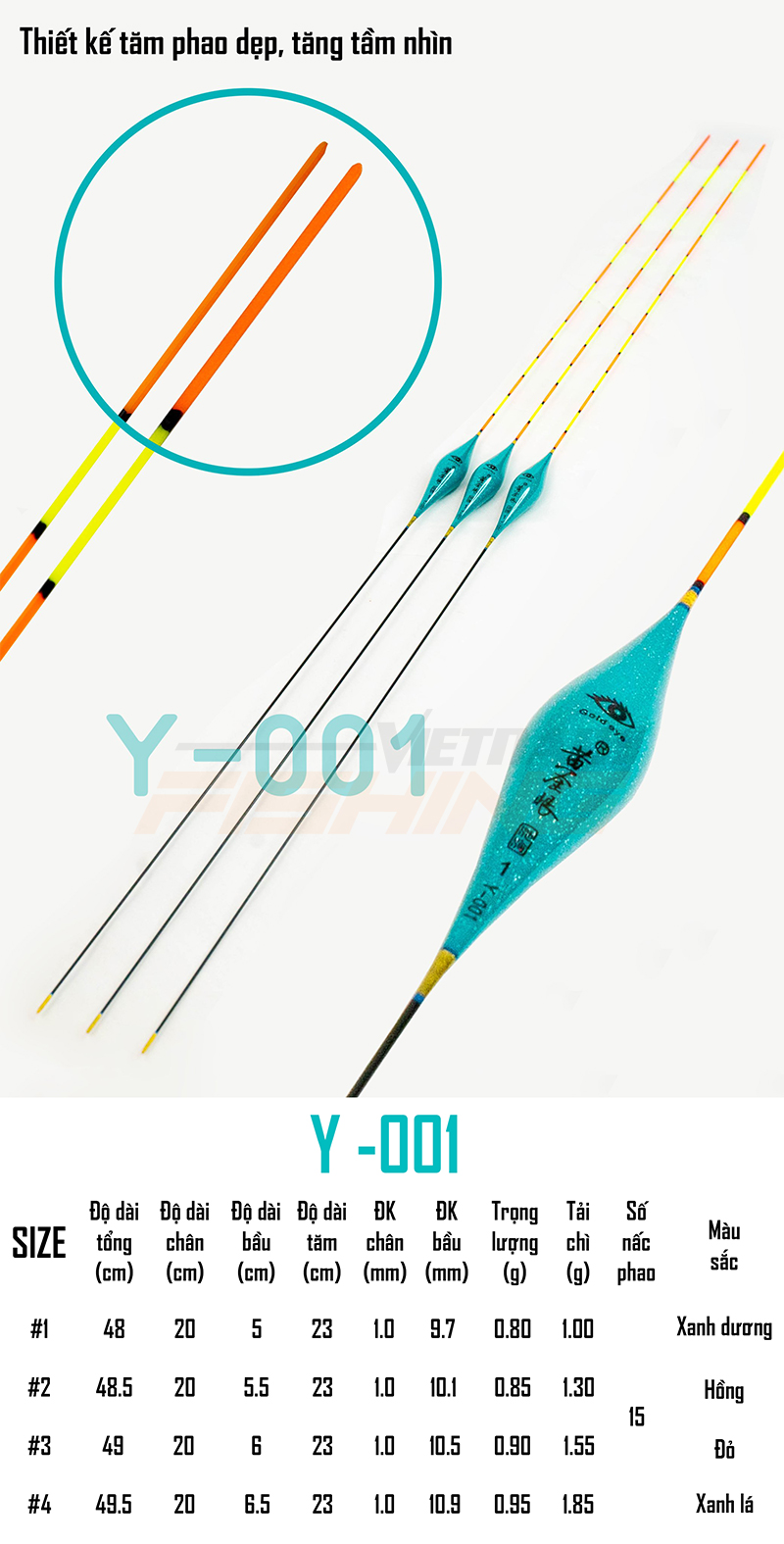 Phao Gold eye Y-004 là mẫu phao Nano câu đài cao cấp của hãng phao Gold Eye, phao được thiết kế với màu sắc trẻ trung, bắt mắt. Tăm phao được làm từ chất liệu carbon, được sơn rõ nét. Phao có độ đồng tầm gần như tuyệt đối, giúp báo cá nhạy, kể cả khi cá ăn mồi nhát, tín hiệu nhẹ. Bầu phao được làm từ vật liệu bọt Nano, cho độ bền cao, không thâm nước, tính ổn định cao.
