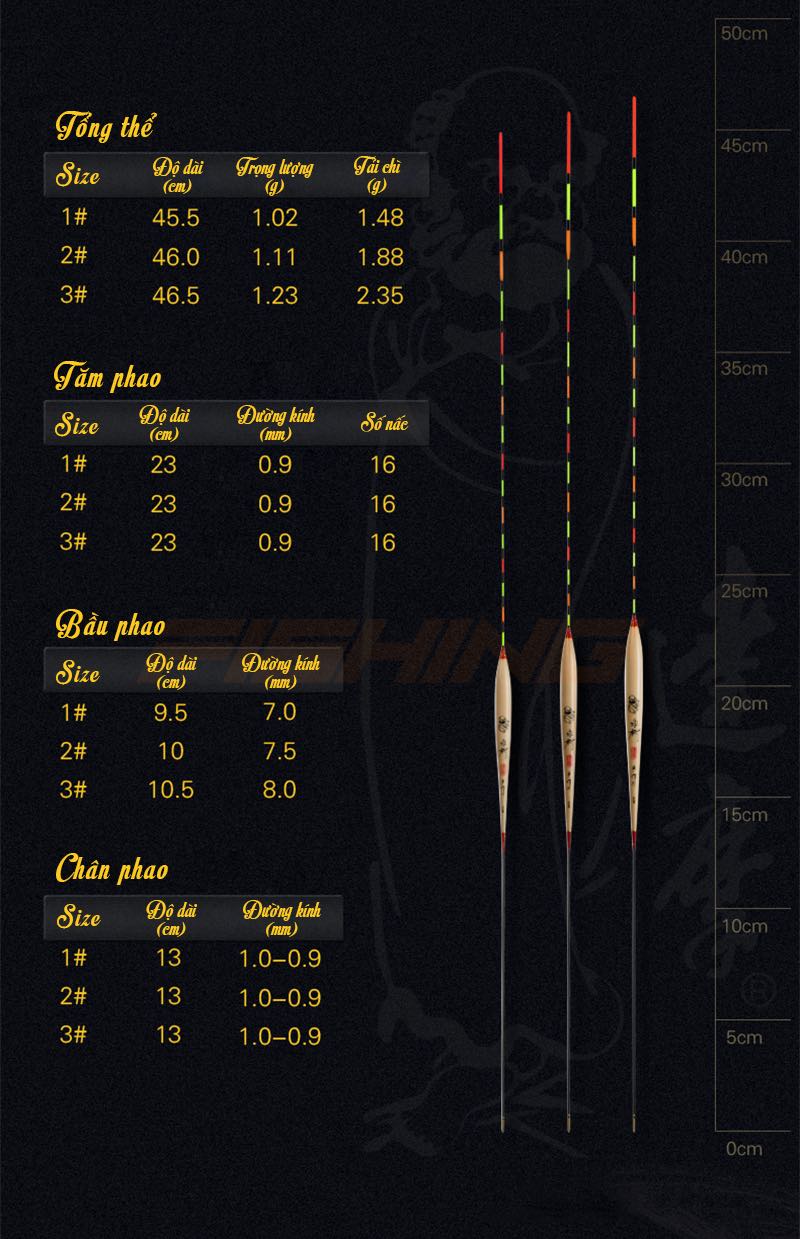 Phao cỏ Đạt Ma CL206 có độ nhạy rất cao, màu tăm bắt mắt, dễ nhìn với 13 nấc phao. Bầu phao được làm thủ công bằng cỏ, nước sơn cao cấp, khó phai, chịu nước, chịu va đập tốt, độ bền cao. Chân phao chất liệu carbon được làm thủ công, độ tinh xảo cao, giúp cải thiện độ nhạy. Phao có 03 Size: #1 tải chì 1,48g; #2 tải chì 1,88g; #3 tải chì 2,55g. Thông số chi tiết vui lòng xem trong ảnh