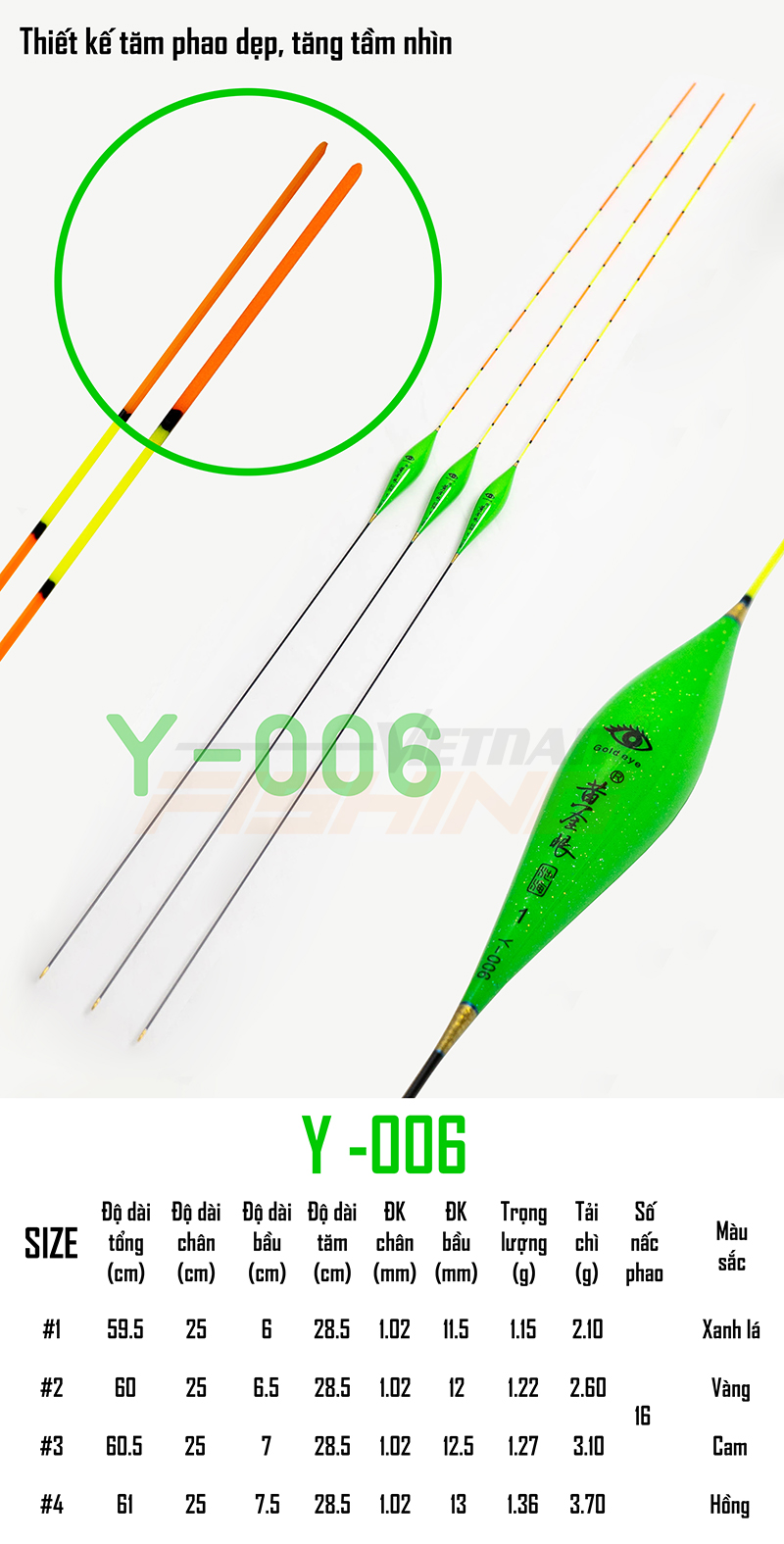 Phao Gold eye Y-006 là mẫu phao Nano câu đài cao cấp của hãng phao Gold Eye, phao được thiết kế với màu sắc trẻ trung, bắt mắt. Tăm phao được làm từ chất liệu carbon, được sơn rõ nét. Phao có độ đồng tầm gần như tuyệt đối, giúp báo cá nhạy, kể cả khi cá ăn mồi nhát, tín hiệu nhẹ. Bầu phao được làm từ vật liệu bọt Nano, cho độ bền cao, không thâm nước, tính ổn định cao.