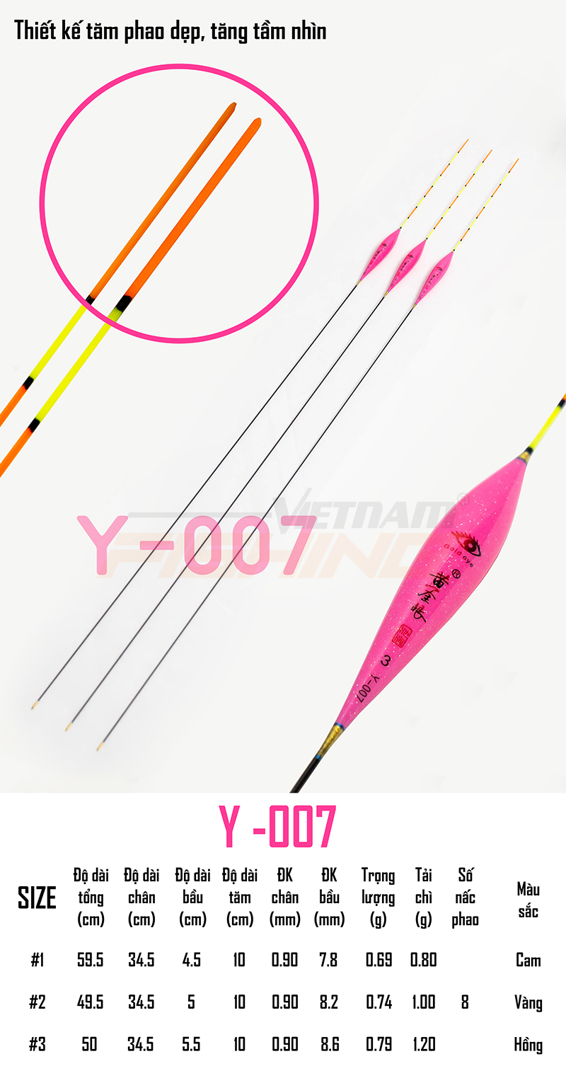 Phao Gold eye Y-007 là mẫu phao Nano câu đài cao cấp của hãng phao Gold Eye, phao được thiết kế với màu sắc trẻ trung, bắt mắt. Tăm phao được làm từ chất liệu carbon, được sơn rõ nét. Phao có độ đồng tầm gần như tuyệt đối, giúp báo cá nhạy, kể cả khi cá ăn mồi nhát, tín hiệu nhẹ. Bầu phao được làm từ vật liệu bọt Nano, cho độ bền cao, không thâm nước, tính ổn định cao.