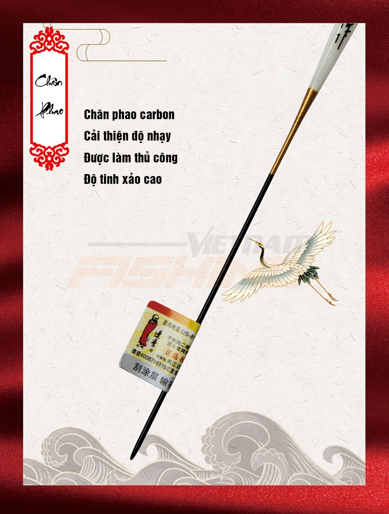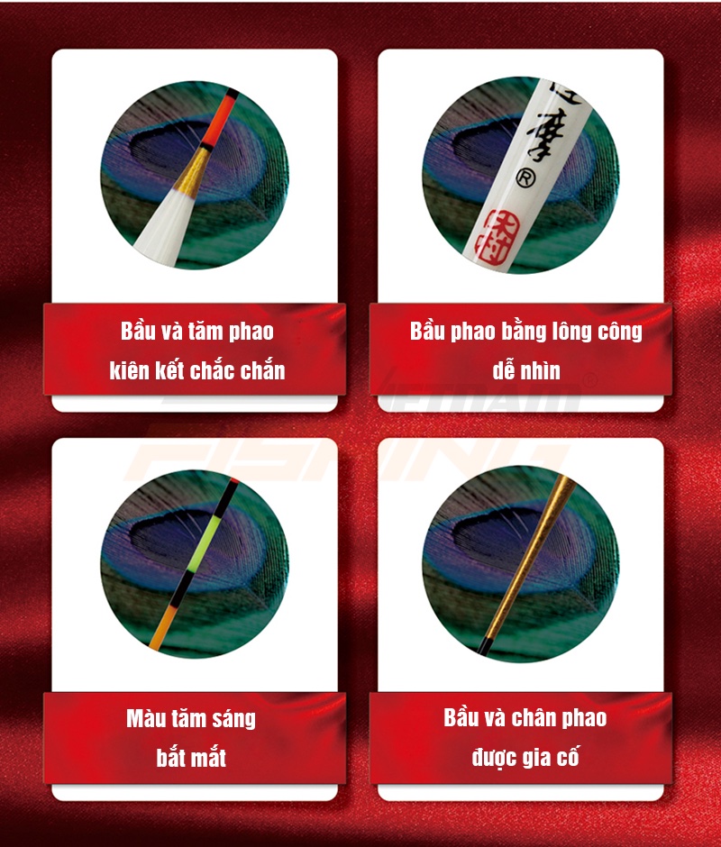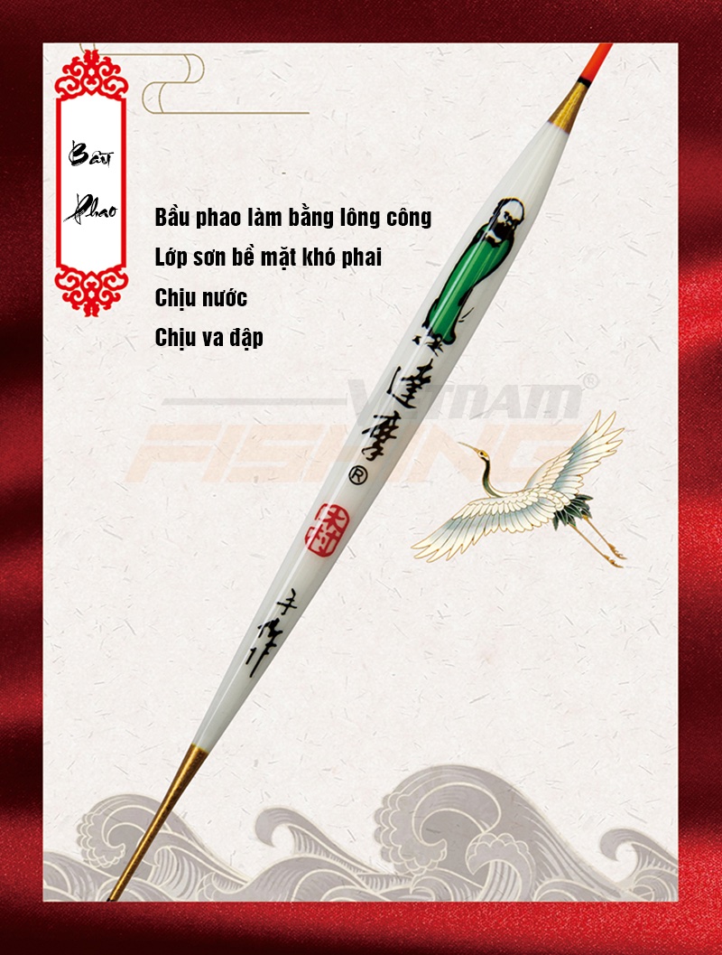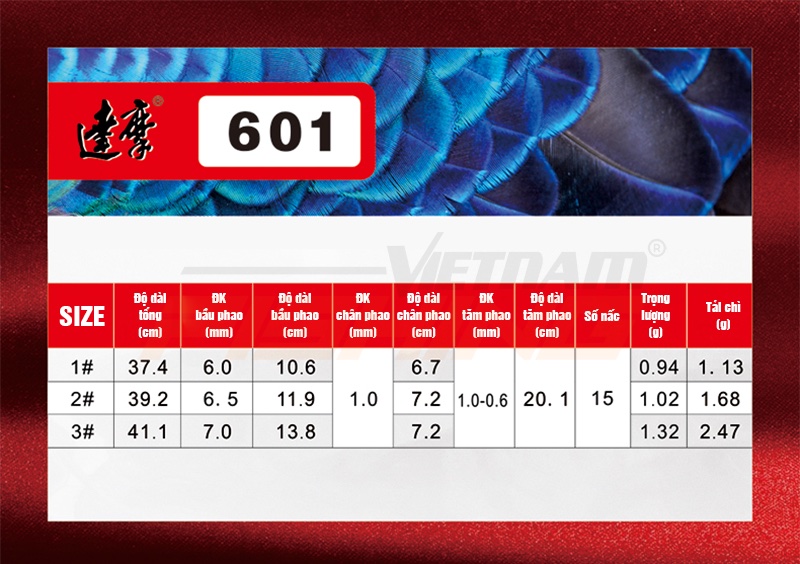 Phao lông công Đạt Ma 601 có độ nhạy rất cao, màu tăm bắt mắt, dễ nhìn. Bầu phao được làm thủ công bằng lông chim công, nước sơn cao cấp, khó phai, chịu nước, chịu va đập tốt, độ bền cao. Chân phao chất liệu carbon được làm thủ công, độ tinh xảo cao, giúp cải thiện độ nhạy. Phao có 03 Size: #1 tải chì 1,13g; #2 tải chì 1,68g; #3 tải chì 2,47g. Thông số chi tiết vui lòng xem trong ảnh