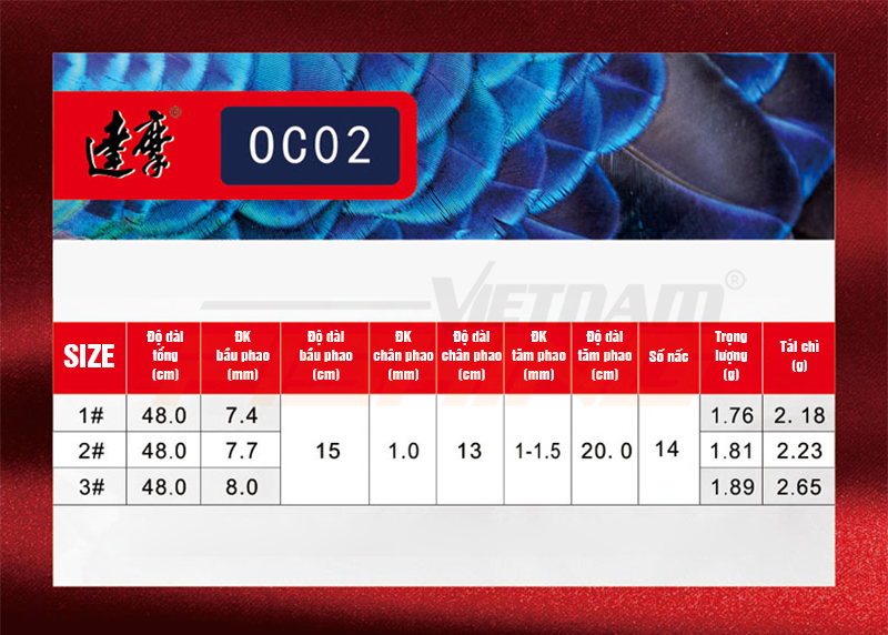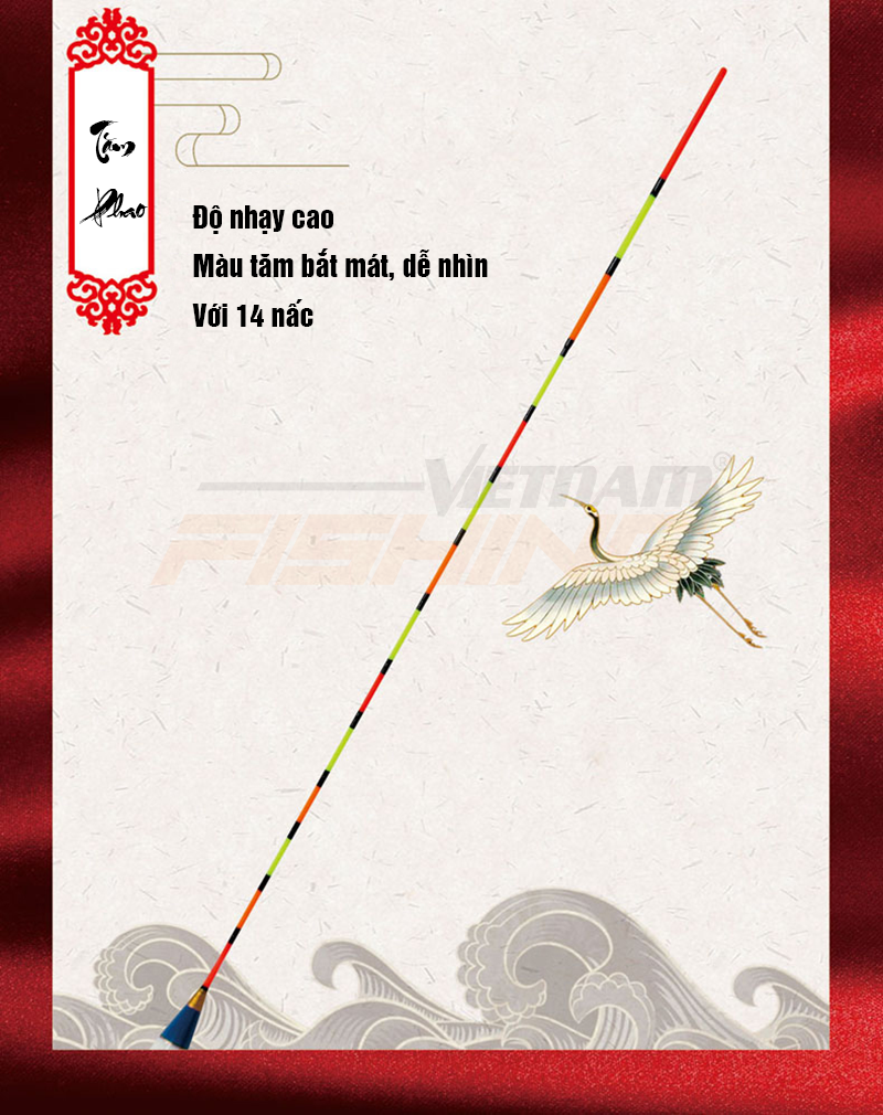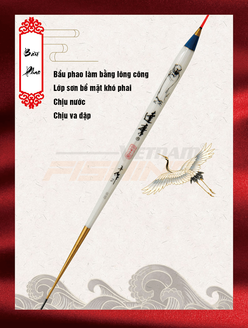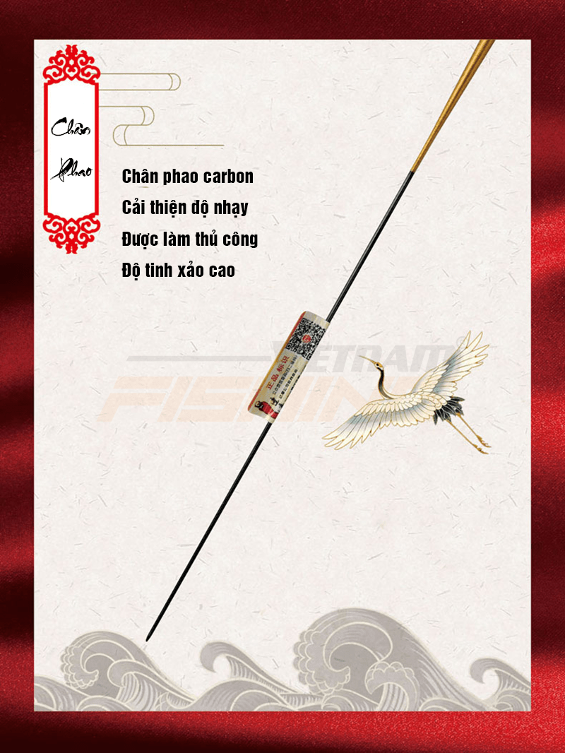 Chân phao cacbon cải thiện độ nhạy,không dễ vỡ,chống ăn mòn,được làm thủ công nên độ tinh xảo cao.Bầu phao làm bằng lông công, lớp sơn bề mặt khó phai,chống thấm nước và chịu va dập,độ đồng tâm cao bền khi sử dụng.Tăm phao với tổng 14 nấc độ nhậy cao, lớp sơn huỳnh quang bắt mắt dễ nhìn, tín hiệu rõ ràng.