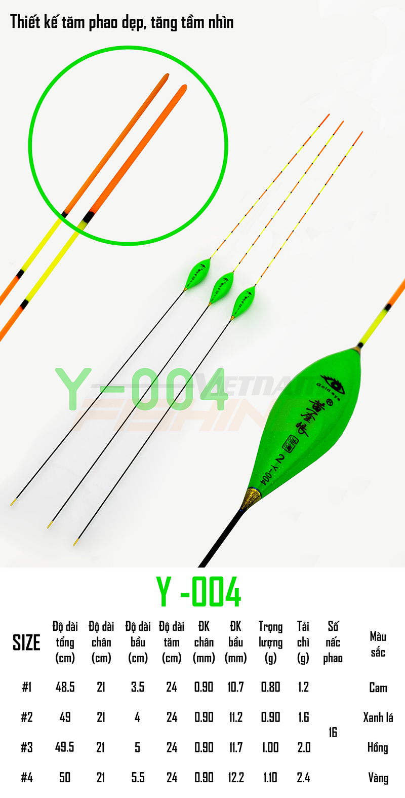 Phao Gold eye Y-004 là mẫu phao Nano câu đài cao cấp của hãng phao Gold Eye, phao được thiết kế với màu sắc trẻ trung, bắt mắt. Tăm phao được làm từ chất liệu carbon, được sơn rõ nét. Phao có độ đồng tầm gần như tuyệt đối, giúp báo cá nhạy, kể cả khi cá ăn mồi nhát, tín hiệu nhẹ. Bầu phao được làm từ vật liệu bọt Nano, cho độ bền cao, không thâm nước, tính ổn định cao.