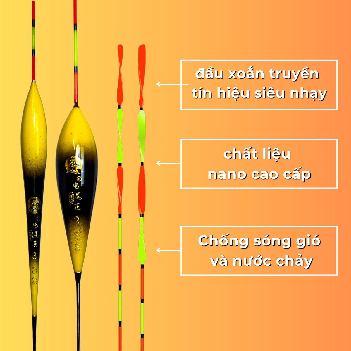 - Tăm phao được đúc nguyên khối , không mối nối tránh bị rơi ra khả năng chống nước và độ nhạy cao hơn.
