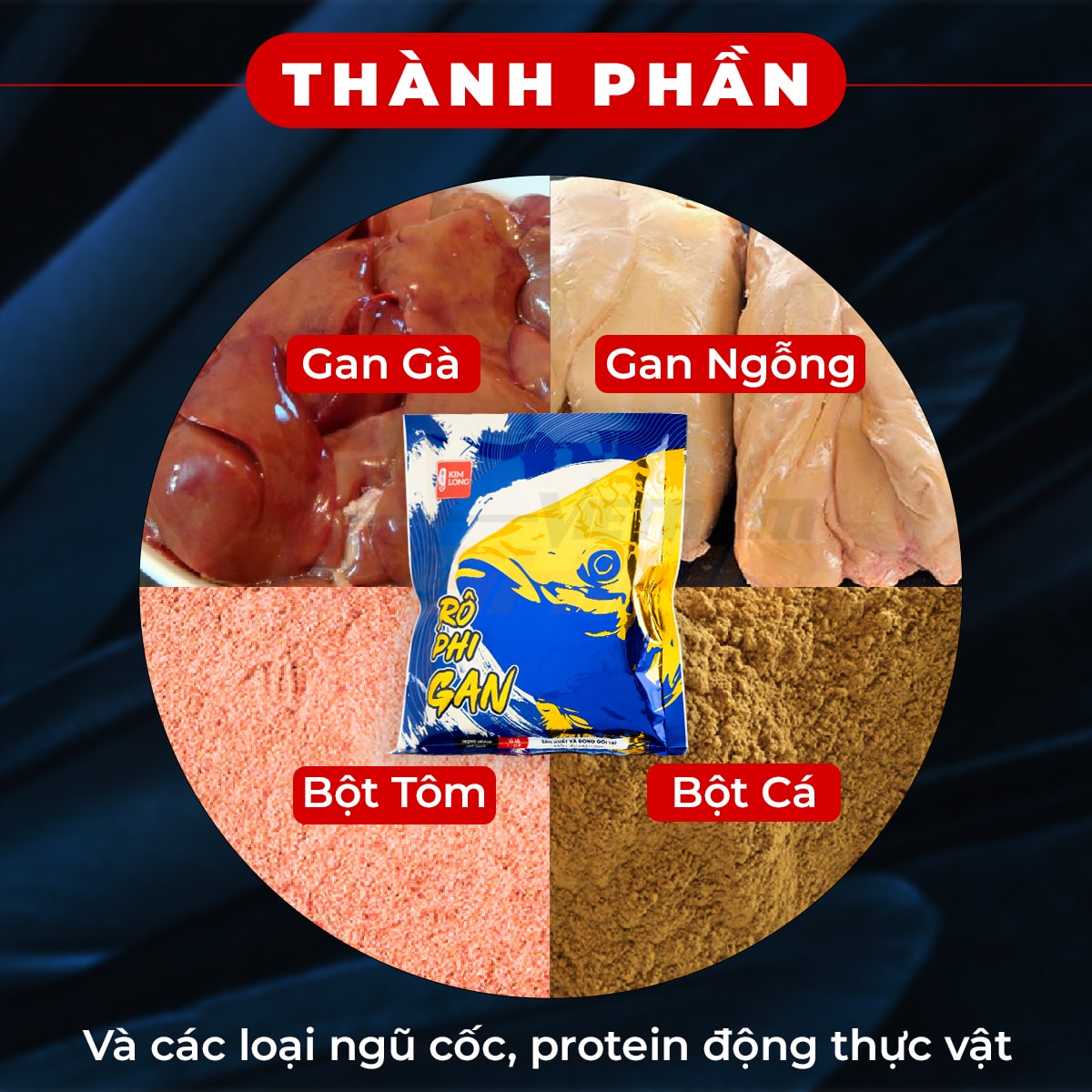 Sản phẩm này lấy thành phần chính từ thức ăn có vị tanh mà cá rô phi yêu thích. Gồm một lượng lớn bột gan gà, gan ngỗng kết hợp thêm bột tôm, bột cá và các protein động thự vật.