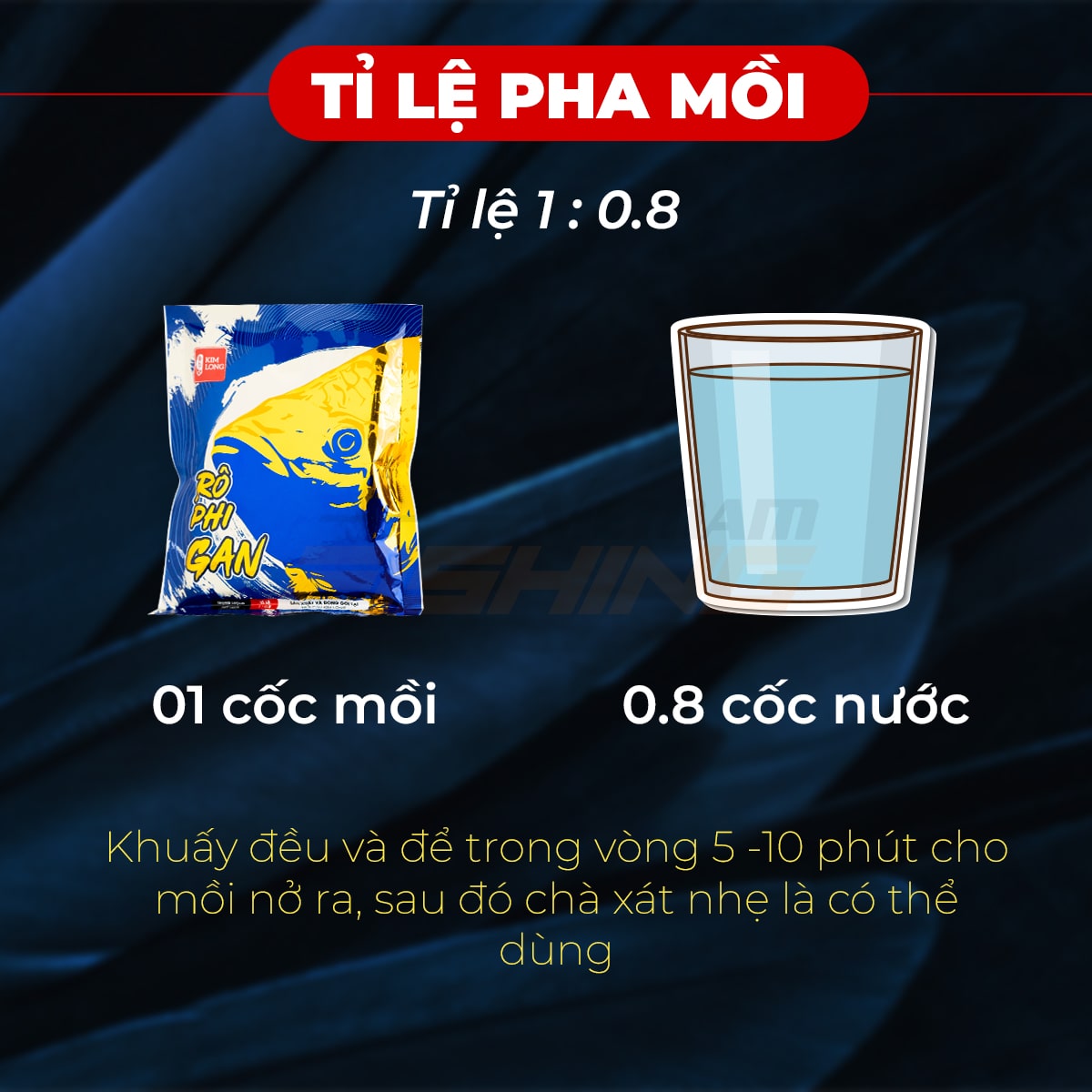 Lấy mồi Rô Phi Gan Kim Long và nước với tỉ lệ 1: 0.8 khuấy đều và để trong vòng 5- 10 phút cho mồi nở ra, sau đó chà sát nhẹ là có thể dùng.