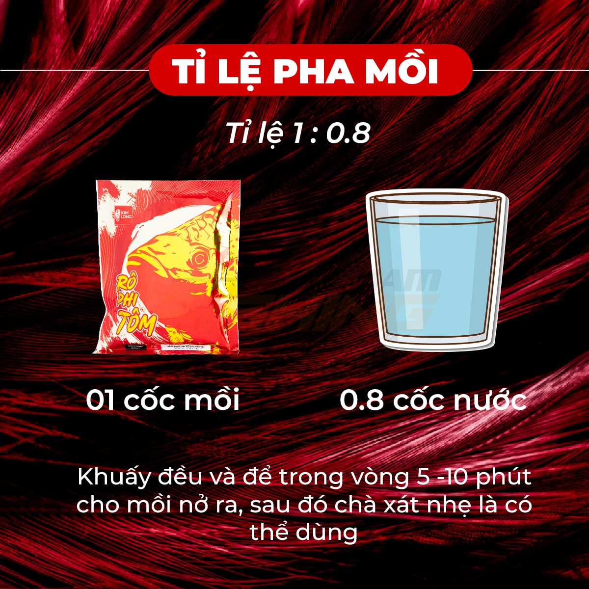 Lấy mồi Rô Phi Tôm Kim Long và nước với tỉ lệ 1: 0.8 khuấy đều và để trong vòng 5- 10 phút cho mồi nở ra, sau đó chà sát nhẹ là có thể dùng.