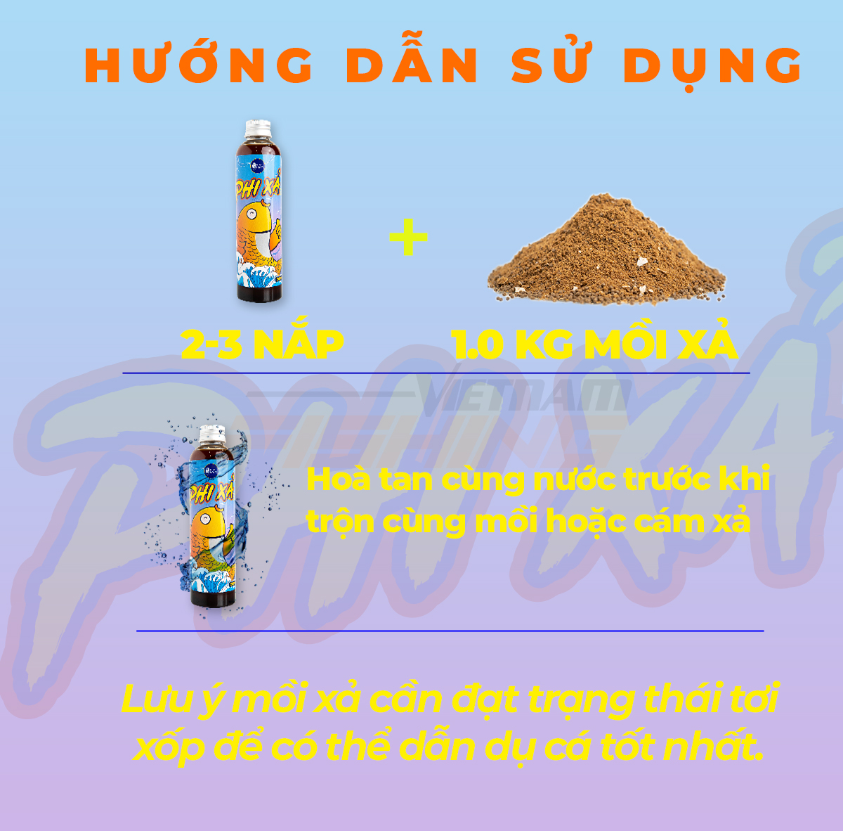 Có thể kết hợp với bất kỳ loại mồi câu và cám xả nào , sử dụng 4-5 nắp Phi Xả Kim Long cho 1kg mồi xả. Hòa tan hương liệu vào nước trước, sau đó cho mồi câu hoặc cám xả vào trộn đều. Lưu ý mồi xả cần đạt trạng thái tơi xốp để có thế dẫn dụ cá tốt nhất