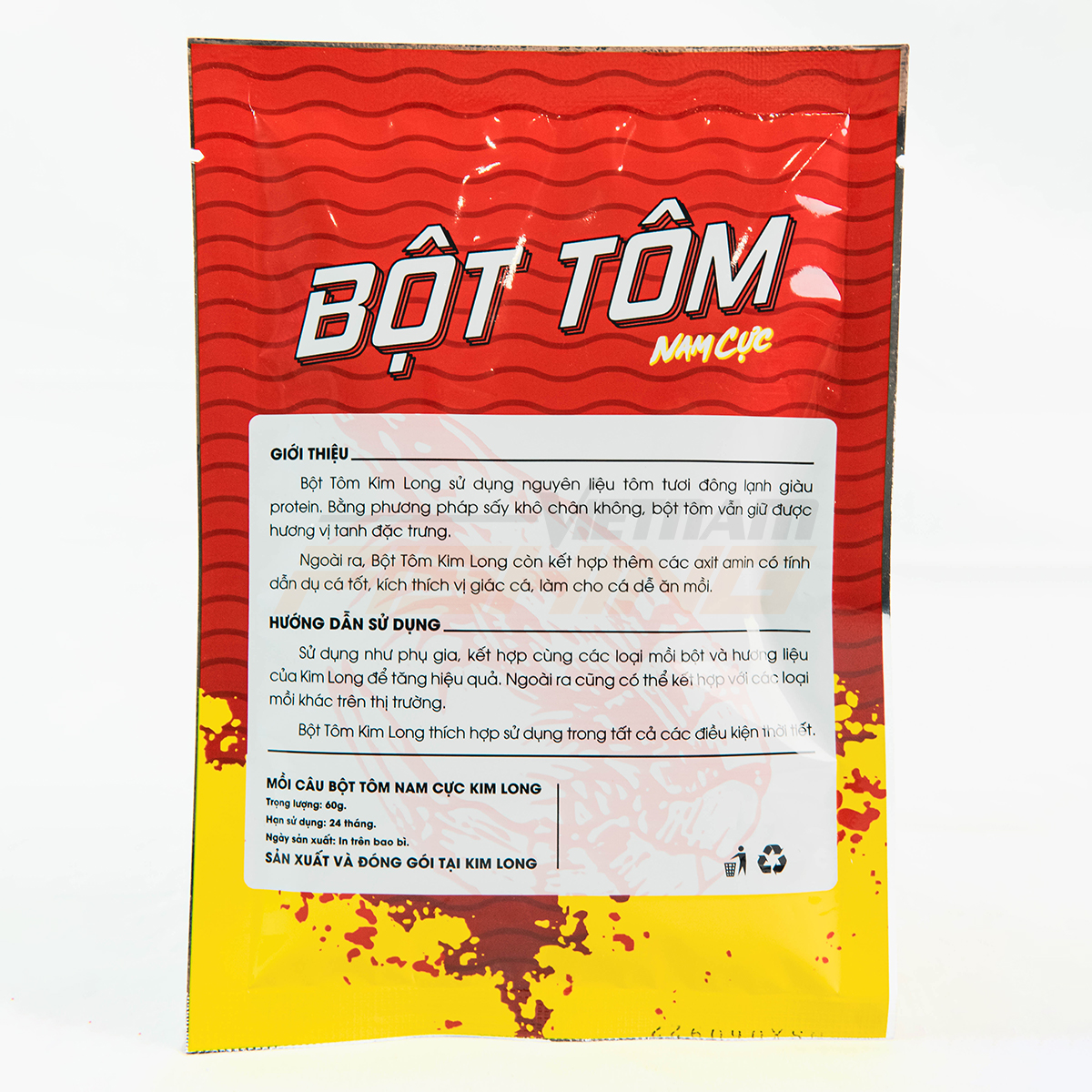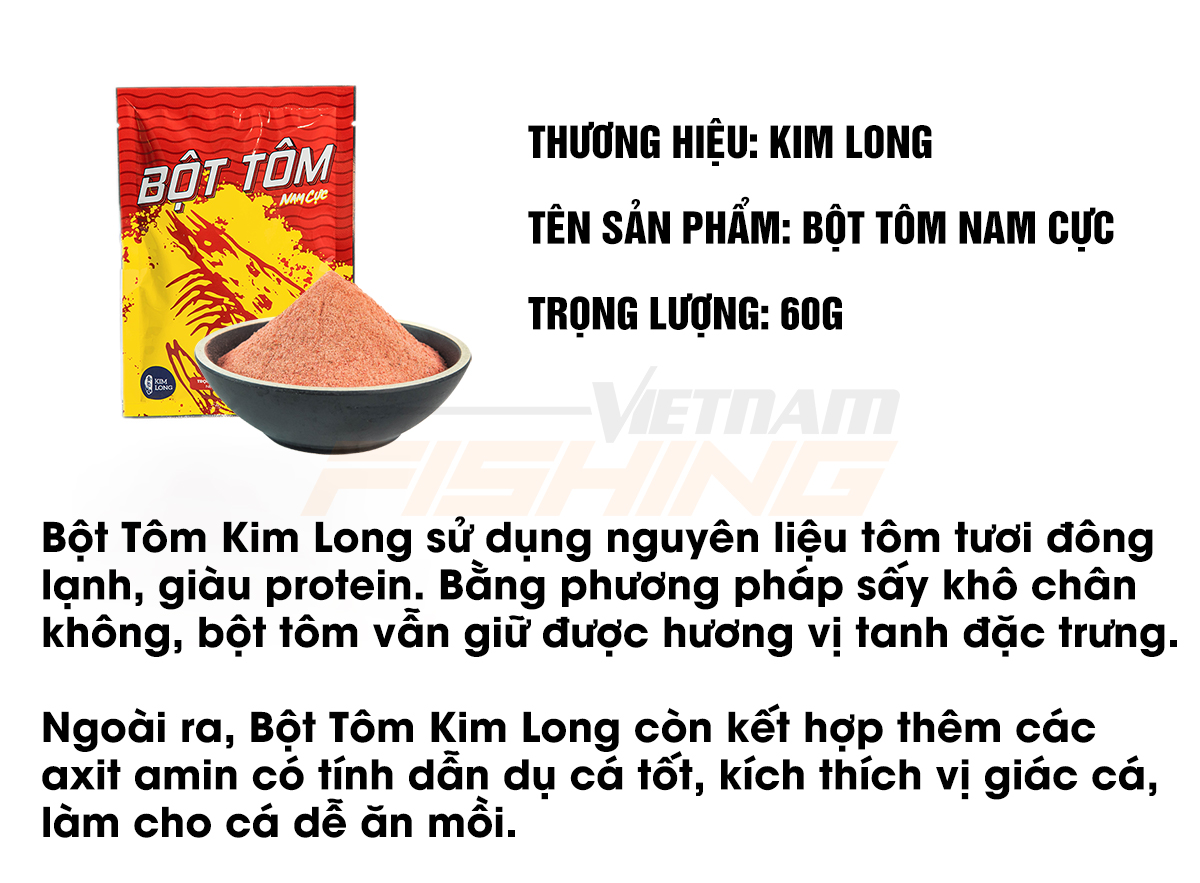 Ngoài ra, Bột Tôm Kim Long còn kết hợp thêm các axit amin làm cho mồi có hương vị tanh thơm đặc trưng có tính dẫn dụ cá tốt, kích thích vị giác cá, làm cho cá dễ ăn mồi